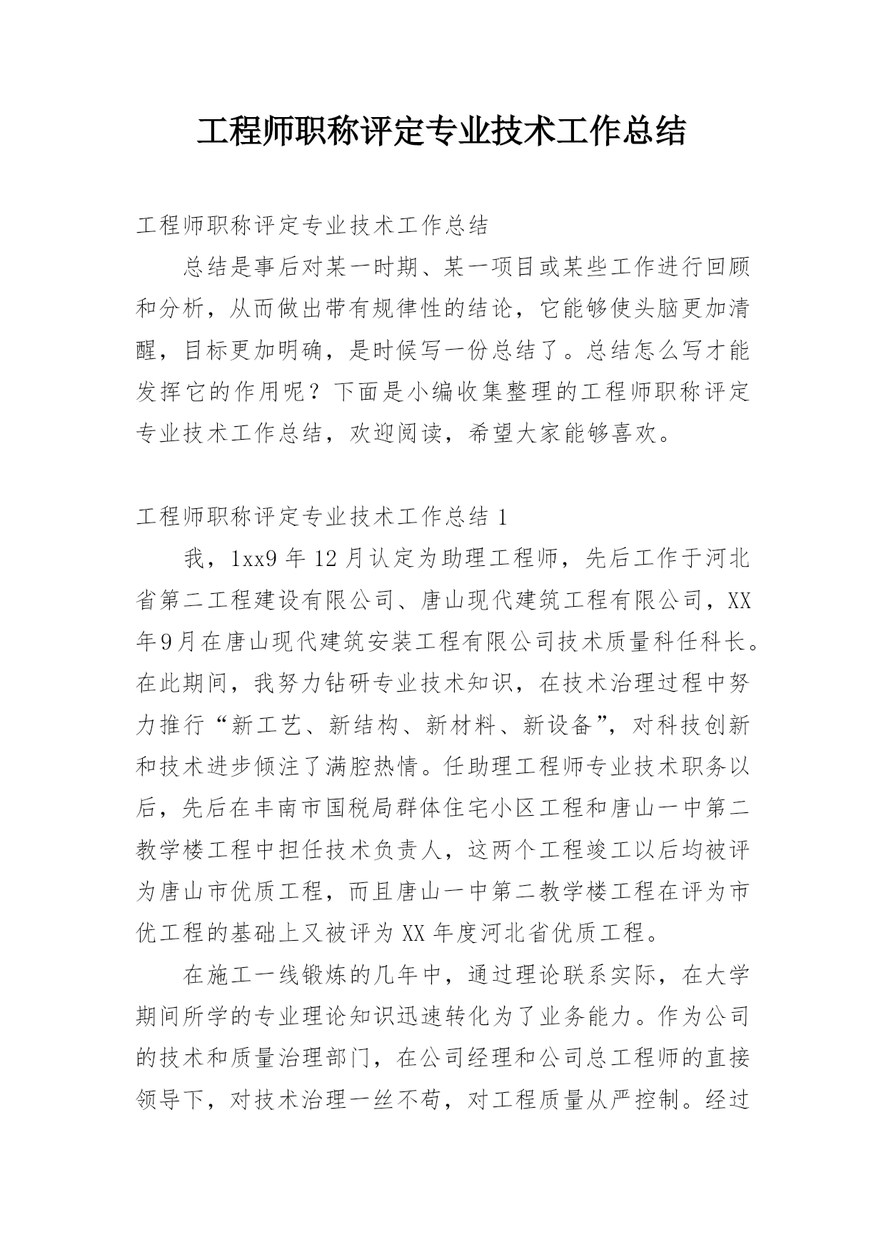 工程师职称评定专业技术工作总结工程师职称评定专业技术工作总结总结是事后对某一时期、某一项目或某些工作进行回顾和分析,从而做出带有规律性的结论,它能够使头脑更加清醒,目标更加明确,是时候写一份总结了。总结怎么写才能发挥它的作用呢?下面是小编收集整理的工程师职称评定专业技术工作总结,欢迎阅读,希望大家能够喜欢。工程师职称评定专业技术工作总结1我,1xx9年12月认定为助理工程师,先后工作于河北省第二工程建设有限公司、唐山现代建筑工程有限公司,XX年9月在唐山现代建筑安装工程有限公司技术质量科任科长。在此期间,