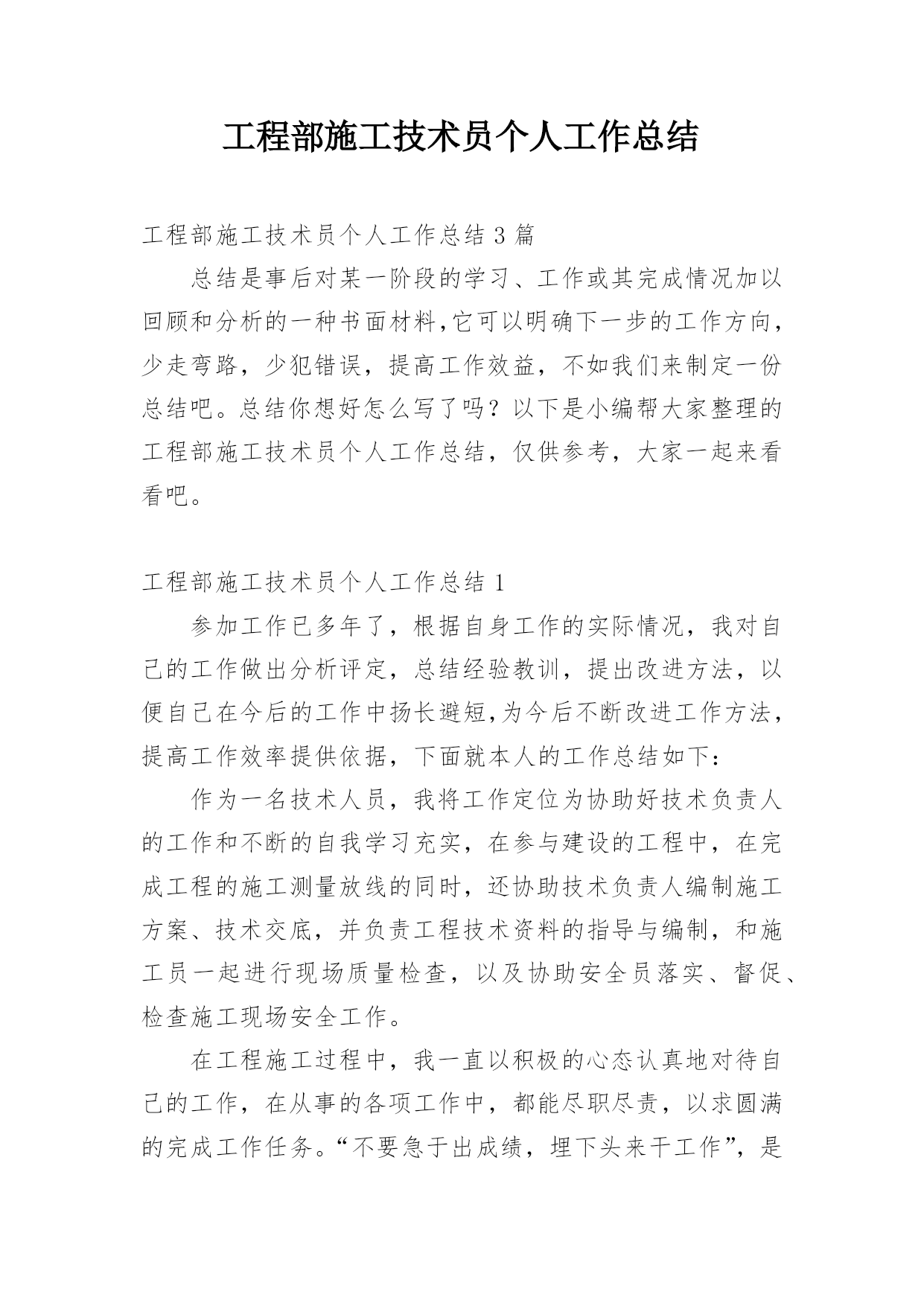 工程部施工技术员个人工作总结工程部施工技术员个人工作总结3篇总结是事后对某一阶段的学习、工作或其完成情况加以回顾和分析的一种书面材料,它可以明确下一步的工作方向,少走弯路,少犯错误,提高工作效益,不如我们来制定一份总结吧。总结你想好怎么写了吗?以下是小编帮大家整理的工程部施工技术员个人工作总结,仅供参考,大家一起来看看吧。工程部施工技术员个人工作总结1参加工作已多年了,根据自身工作的实际情况,我对自己的工作做出分析评定,总结经验教训,提出改进方法,以便自己在今后的工作中扬长避短,为今后不断改进工作方法,提