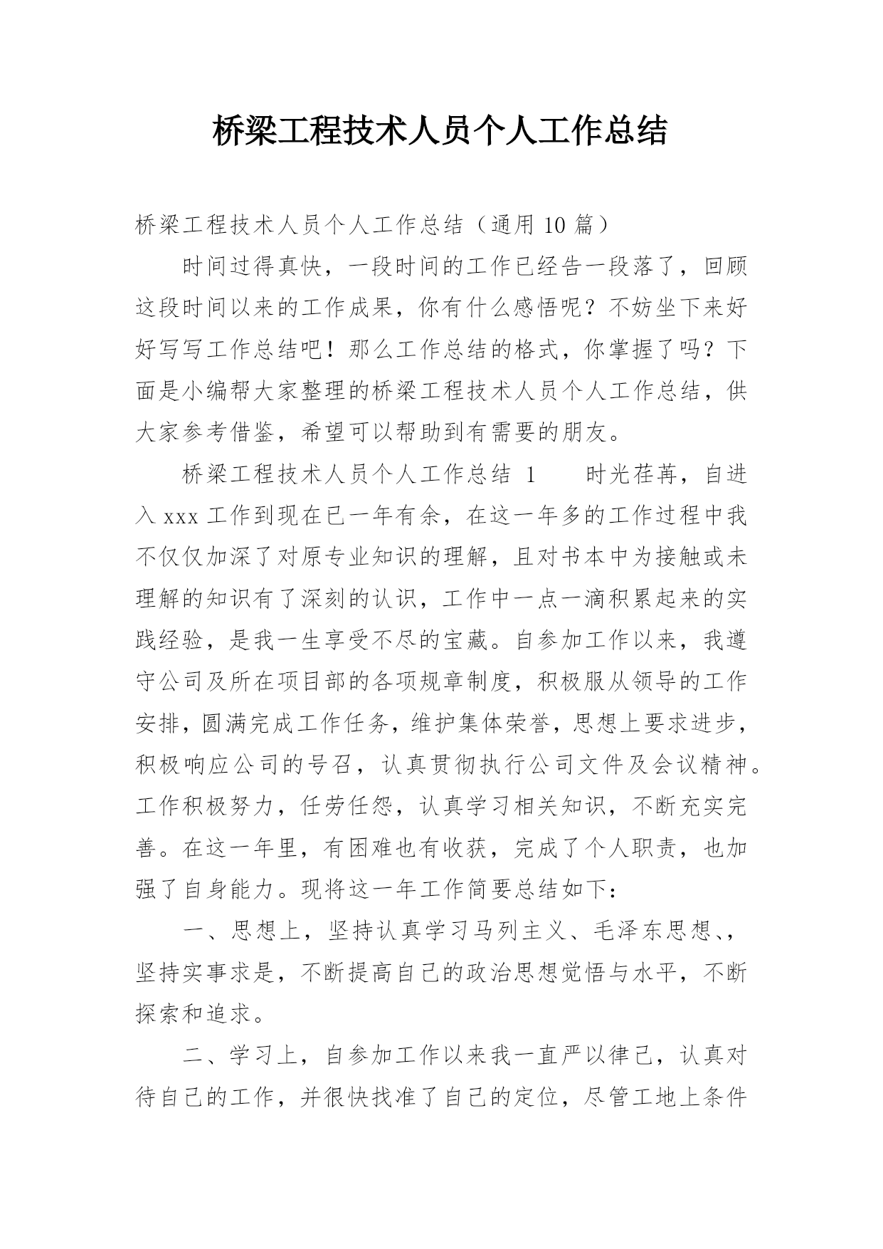 桥梁工程技术人员个人工作总结桥梁工程技术人员个人工作总结(通用10篇)时间过得真快,一段时间的工作已经告一段落了,回顾这段时间以来的工作成果,你有什么感悟呢?不妨坐下来好好写写工作总结吧!那么工作总结的格式,你掌握了吗?下面是小编帮大家整理的桥梁工程技术人员个人工作总结,供大家参考借鉴,希望可以帮助到有需要的朋友。桥梁工程技术人员个人工作总结1时光荏苒,自进入xxx工作到现在已一年有余,在这一年多的工作过程中我不仅仅加深了对原专业知识的理解,且对书本中为接触或未理解的知识有了深刻的认识,工作中一点一滴积累
