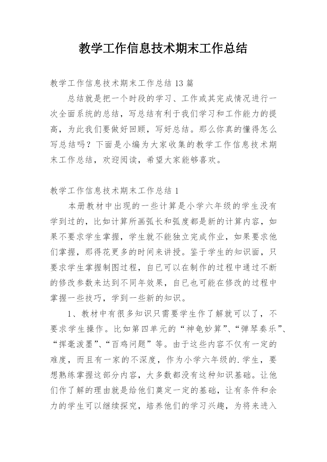 教学工作信息技术期末工作总结教学工作信息技术期末工作总结13篇总结就是把一个时段的学习、工作或其完成情况进行一次全面系统的总结,写总结有利于我们学习和工作能力的提高,为此我们要做好回顾,写好总结。那么你真的懂得怎么写总结吗?下面是小编为大家收集的教学工作信息技术期末工作总结,欢迎阅读,希望大家能够喜欢。教学工作信息技术期末工作总结1本册教材中出现的一些计算是小学六年级的学生没有学到过的,比如计算所画弧长和弧度都是新的计算内容,如果不要求学生掌握,学生就不能独立完成作业,如果要求他们掌握,那得花更多的时间来