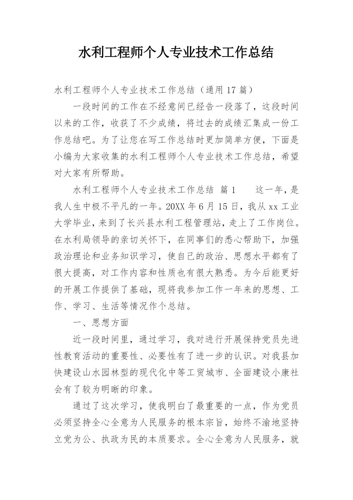 水利工程师个人专业技术工作总结水利工程师个人专业技术工作总结(通用17篇)一段时间的工作在不经意间已经告一段落了,这段时间以来的工作,收获了不少成绩,将过去的成绩汇集成一份工作总结吧。为了让您在写工作总结时更加简单方便,下面是小编为大家收集的水利工程师个人专业技术工作总结,希望对大家有所帮助。水利工程师个人专业技术工作总结篇1这一年,是我人生中极不平凡的一年。20XX年6月15日,我从xx工业大学毕业,来到了长兴县水利工程管理站,走上了工作岗位。在水利局领导的亲切关怀下,在同事们的悉心帮助下,加强政治理论