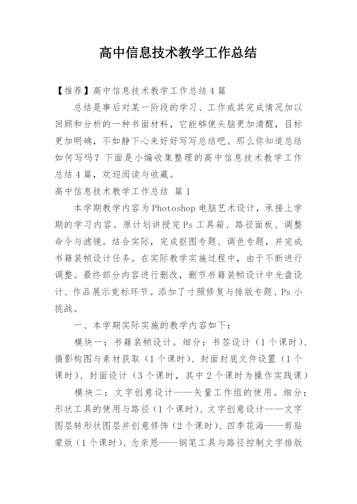 高中信息技术教学工作总结【推荐】高中信息技术教学工作总结4篇总结是事后对某一阶段的学习、工作或其完成情况加以回顾和分析的一种书面材料,它能够使头脑更加清醒,目标更加明确,不如静下心来好好写写总结吧。那么你知道总结如何写吗?下面是小编收集整理的高中信息技术教学工作总结4篇,欢迎阅读与收藏。高中信息技术教学工作总结篇1本学期教学内容为Photoshop电脑艺术设计,承接上学期的学习内容。原计划讲授完Ps工具箱、路径面板、调整命令与滤镜。结合实际,完成抠图专题、调色专题,并完成书籍装帧设计任务。在实际教学实施过