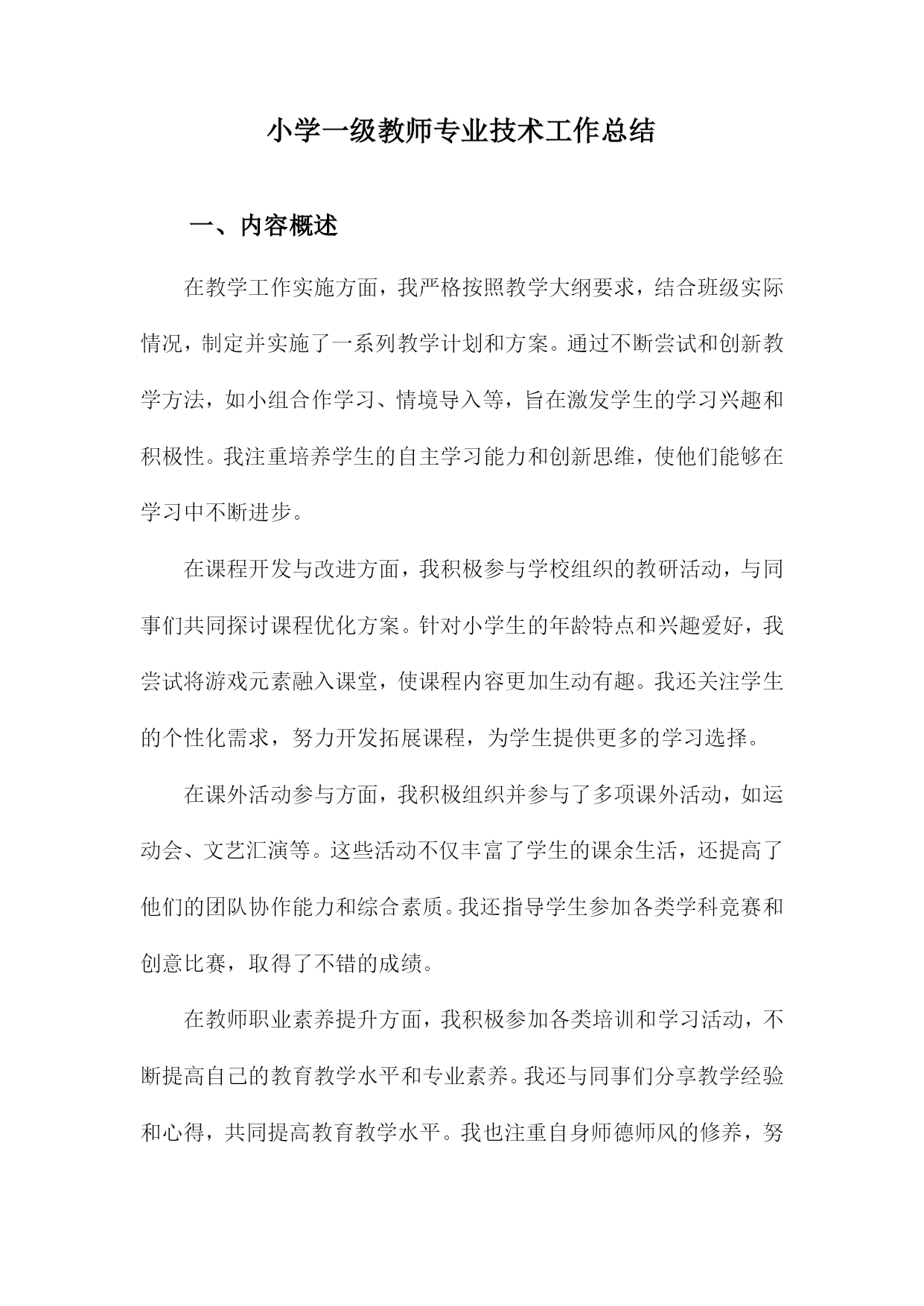小学一级教师专业技术工作总结一、内容概述在教学工作实施方面,我严格按照教学大纲要求,结合班级实际情况,制定并实施了一系列教学计划和方案。通过不断尝试和创新教学方法,如小组合作学习、情境导入等,旨在激发学生的学习兴趣和积极性。我注重培养学生的自主学习能力和创新思维,使他们能够在学习中不断进步。在课程开发与改进方面,我积极参与学校组织的教研活动,与同事们共同探讨课程优化方案。针对小学生的年龄特点和兴趣爱好,我尝试将游戏元素融入课堂,使课程内容更加生动有趣。我还关注学生的个性化需求,努力开发拓展课程,为学生提供