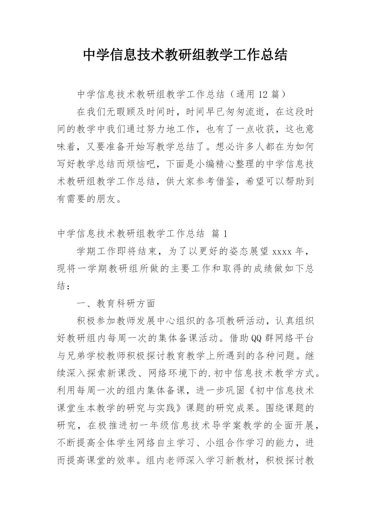 中学信息技术教研组教学工作总结中学信息技术教研组教学工作总结(通用12篇)在我们无暇顾及时间时,时间早已匆匆流逝,在这段时间的教学中我们通过努力地工作,也有了一点收获,这也意味着,又要准备开始写教学总结了。想必许多人都在为如何写好教学总结而烦恼吧,下面是小编精心整理的中学信息技术教研组教学工作总结,供大家参考借鉴,希望可以帮助到有需要的朋友。中学信息技术教研组教学工作总结篇1学期工作即将结束,为了以更好的姿态展望xxxx年,现将一学期教研组所做的主要工作和取得的成绩做如下总结:一、教育科研方面积极参加教师
