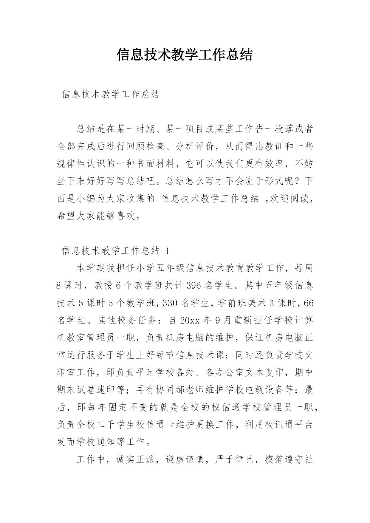 信息技术教学工作总结信息技术教学工作总结总结是在某一时期、某一项目或某些工作告一段落或者全部完成后进行回顾检查、分析评价,从而得出教训和一些规律性认识的一种书面材料,它可以使我们更有效率,不妨坐下来好好写写总结吧。总结怎么写才不会流于形式呢?下面是小编为大家收集的信息技术教学工作总结,欢迎阅读,希望大家能够喜欢。信息技术教学工作总结1本学期我担任小学五年级信息技术教育教学工作,每周8课时,教授6个教学班共计396名学生。其中五年级信息技术5课时5个教学班,330名学生,学前班美术3课时,66名学生。其他校