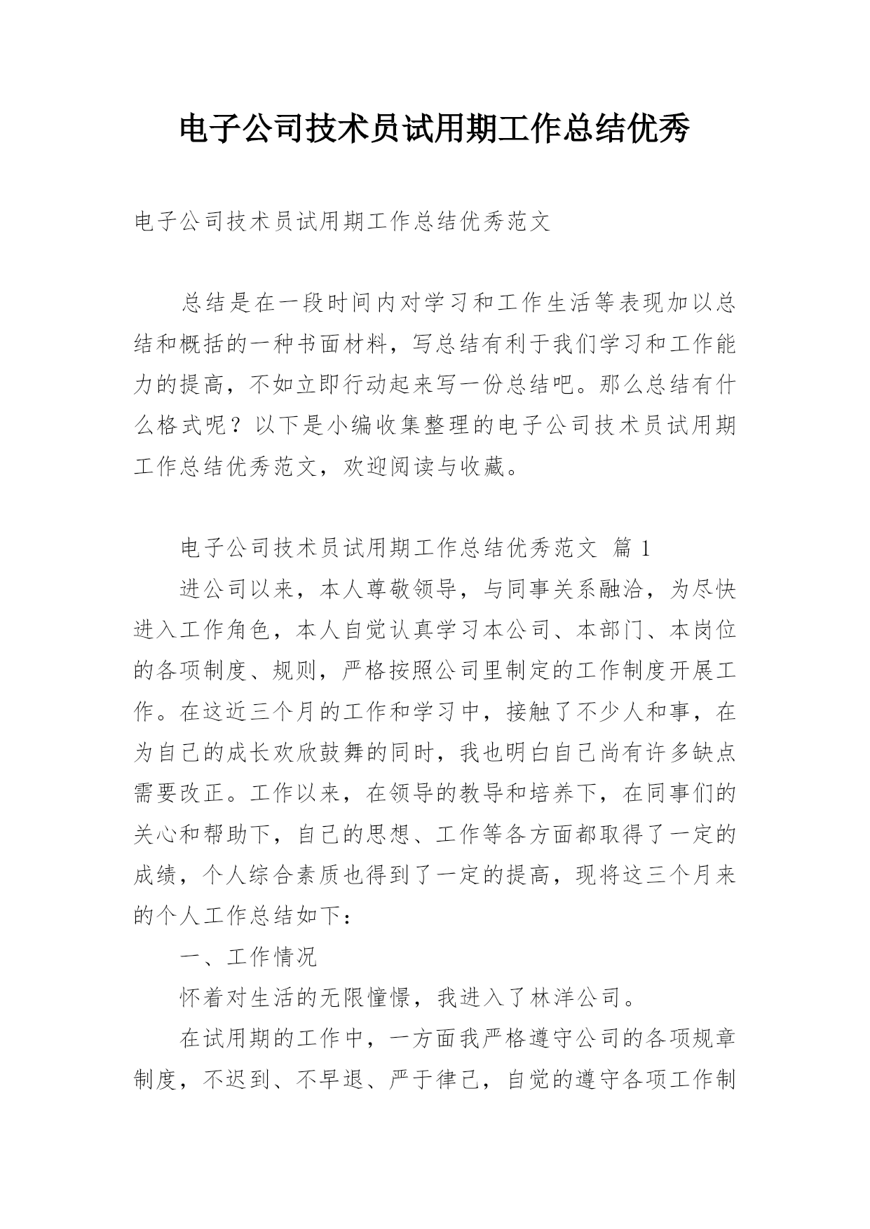 电子公司技术员试用期工作总结优秀电子公司技术员试用期工作总结优秀范文总结是在一段时间内对学习和工作生活等表现加以总结和概括的一种书面材料,写总结有利于我们学习和工作能力的提高,不如立即行动起来写一份总结吧。那么总结有什么格式呢?以下是小编收集整理的电子公司技术员试用期工作总结优秀范文,欢迎阅读与收藏。电子公司技术员试用期工作总结优秀范文篇1进公司以来,本人尊敬领导,与同事关系融洽,为尽快进入工作角色,本人自觉认真学习本公司、本部门、本岗位的各项制度、规则,严格按照公司里制定的工作制度开展工作。在这近三个月