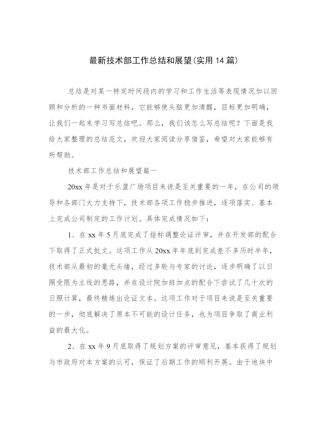 最新技术部工作总结和展望(实用14篇)总结是对某一特定时间段内的学习和工作生活等表现情况加以回顾和分析的一种书面材料,它能够使头脑更加清醒,目标更加明确,让我们一起来学习写总结吧。那么,我们该怎么写总结呢?下面是我给大家整理的总结范文,欢迎大家阅读分享借鉴,希望对大家能够有所帮助。技术部工作总结和展望篇一20xx年是对于乐盈广场项目来说是至关重要的一年,在公司的领导和各部门大力支持下,技术部各项工作稳步推进,逐项落实、基本上完成公司制定的工作计划。具体完成情况如下:1、在xx年5月底完成了指标调整论证评审