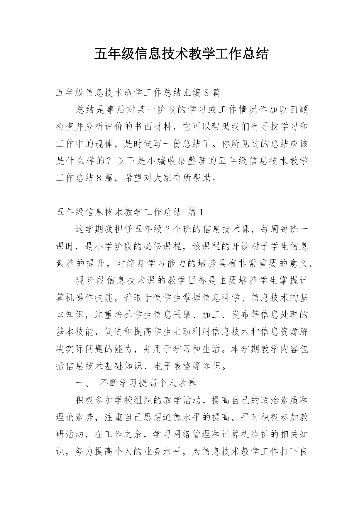 五年级信息技术教学工作总结五年级信息技术教学工作总结汇编8篇总结是事后对某一阶段的学习或工作情况作加以回顾检查并分析评价的书面材料,它可以帮助我们有寻找学习和工作中的规律,是时候写一份总结了。你所见过的总结应该是什么样的?以下是小编收集整理的五年级信息技术教学工作总结8篇,希望对大家有所帮助。五年级信息技术教学工作总结篇1这学期我担任五年级2个班的信息技术课,每周每班一课时,是小学阶段的必修课程,该课程的开设对于学生信息素养的提升,对终身学习能力的培养具有非常重要的意义。现阶段信息技术课的教学目标是主要培