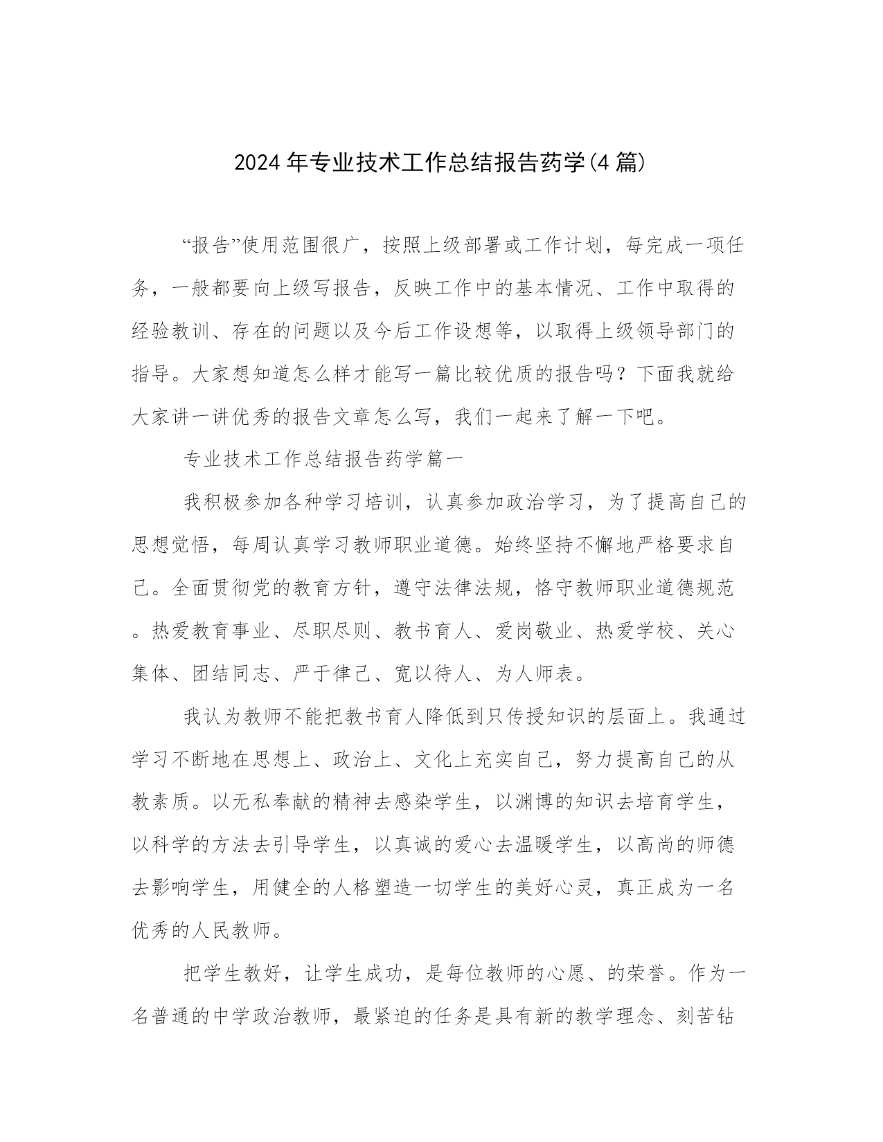 2024年专业技术工作总结报告药学(4篇)“报告”使用范围很广,按照上级部署或工作计划,每完成一项任务,一般都要向上级写报告,反映工作中的基本情况、工作中取得的经验教训、存在的问题以及今后工作设想等,以取得上级领导部门的指导。大家想知道怎么样才能写一篇比较优质的报告吗?下面我就给大家讲一讲优秀的报告文章怎么写,我们一起来了解一下吧。专业技术工作总结报告药学篇一我积极参加各种学习培训,认真参加政治学习,为了提高自己的思想觉悟,每周认真学习教师职业道德。始终坚持不懈地严格要求自己。全面贯彻党的教育方针,遵守法