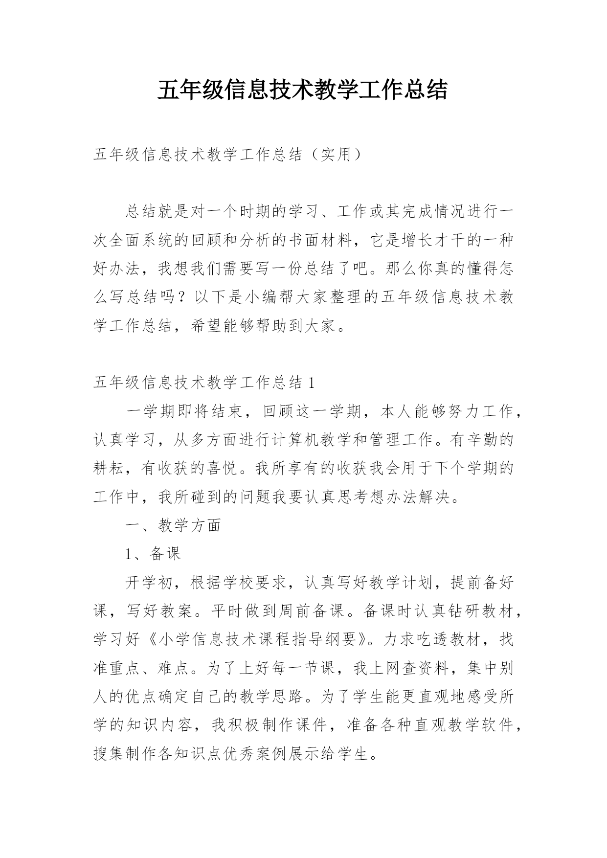 五年级信息技术教学工作总结五年级信息技术教学工作总结(实用)总结就是对一个时期的学习、工作或其完成情况进行一次全面系统的回顾和分析的书面材料,它是增长才干的一种好办法,我想我们需要写一份总结了吧。那么你真的懂得怎么写总结吗?以下是小编帮大家整理的五年级信息技术教学工作总结,希望能够帮助到大家。五年级信息技术教学工作总结1一学期即将结束,回顾这一学期,本人能够努力工作,认真学习,从多方面进行计算机教学和管理工作。有辛勤的耕耘,有收获的喜悦。我所享有的收获我会用于下个学期的工作中,我所碰到的问题我要认真思考想