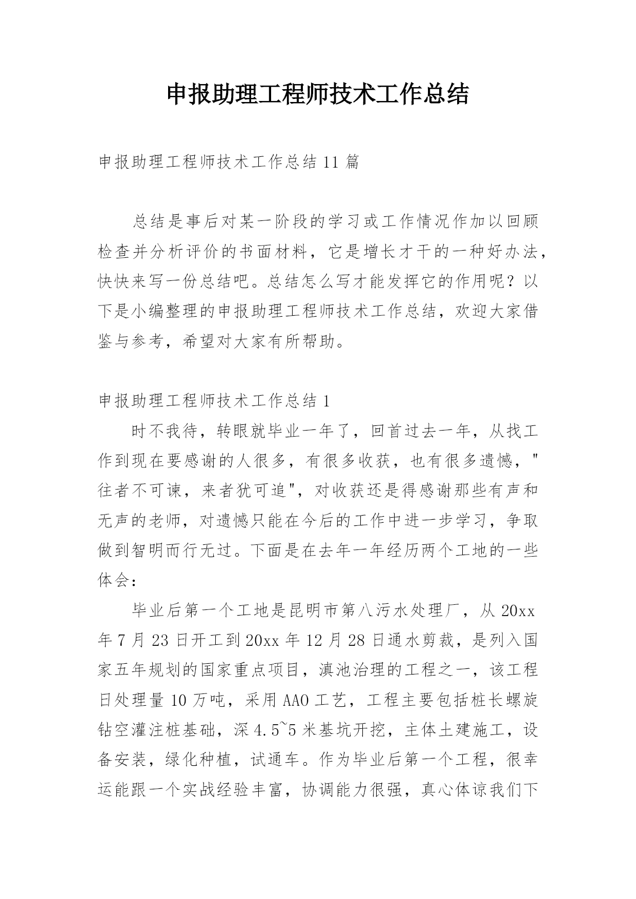 申报助理工程师技术工作总结申报助理工程师技术工作总结11篇总结是事后对某一阶段的学习或工作情况作加以回顾检查并分析评价的书面材料,它是增长才干的一种好办法,快快来写一份总结吧。总结怎么写才能发挥它的作用呢?以下是小编整理的申报助理工程师技术工作总结,欢迎大家借鉴与参考,希望对大家有所帮助。申报助理工程师技术工作总结1时不我待,转眼就毕业一年了,回首过去一年,从找工作到现在要感谢的人很多,有很多收获,也有很多遗憾,"往者不可谏,来者犹可追",对收获还是得感谢那些有声和无声的老师,对遗憾只能在今后的工作中进一
