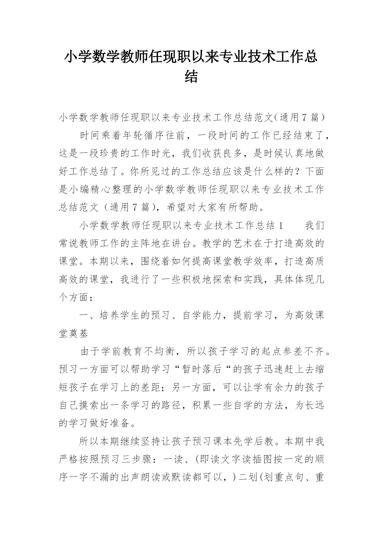 小学数学教师任现职以来专业技术工作总结小学数学教师任现职以来专业技术工作总结范文(通用7篇)时间乘着年轮循序往前,一段时间的工作已经结束了,这是一段珍贵的工作时光,我们收获良多,是时候认真地做好工作总结了。你所见过的工作总结应该是什么样的?下面是小编精心整理的小学数学教师任现职以来专业技术工作总结范文(通用7篇),希望对大家有所帮助。小学数学教师任现职以来专业技术工作总结1我们常说教师工作的主阵地在讲台。教学的艺术在于打造高效的课堂。本期以来,围绕着如何提高课堂教学效率,打造高质高效的课堂,我进行了一些积