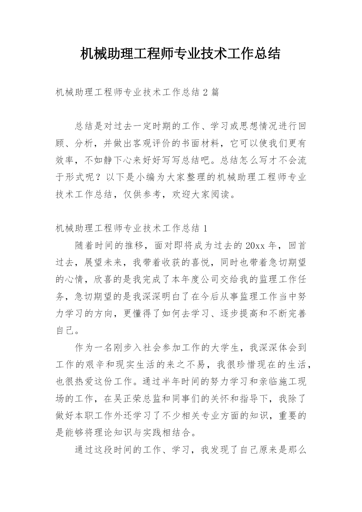 机械助理工程师专业技术工作总结机械助理工程师专业技术工作总结2篇总结是对过去一定时期的工作、学习或思想情况进行回顾、分析,并做出客观评价的书面材料,它可以使我们更有效率,不如静下心来好好写写总结吧。总结怎么写才不会流于形式呢?以下是小编为大家整理的机械助理工程师专业技术工作总结,仅供参考,欢迎大家阅读。机械助理工程师专业技术工作总结1随着时间的推移,面对即将成为过去的20xx年,回首过去,展望未来,我带着收获的喜悦,同时也带着急切期望的心情,欣喜的是我完成了本年度公司交给我的监理工作任务,急切期望的是我深