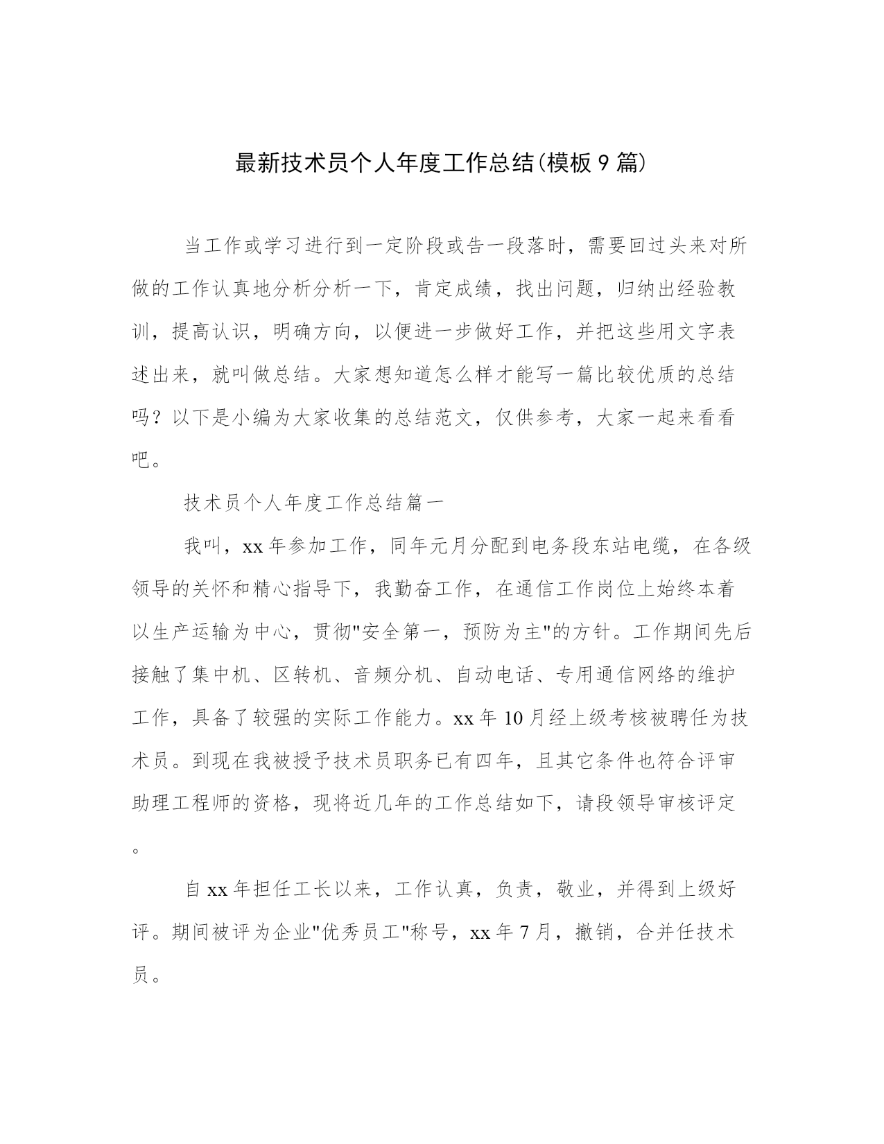 最新技术员个人年度工作总结(模板9篇)当工作或学习进行到一定阶段或告一段落时,需要回过头来对所做的工作认真地分析分析一下,肯定成绩,找出问题,归纳出经验教训,提高认识,明确方向,以便进一步做好工作,并把这些用文字表述出来,就叫做总结。大家想知道怎么样才能写一篇比较优质的总结吗?以下是小编为大家收集的总结范文,仅供参考,大家一起来看看吧。技术员个人年度工作总结篇一我叫,xx年参加工作,同年元月分配到电务段东站电缆,在各级领导的关怀和精心指导下,我勤奋工作,在通信工作岗位上始终本着以生产运输为中心,贯彻"安全
