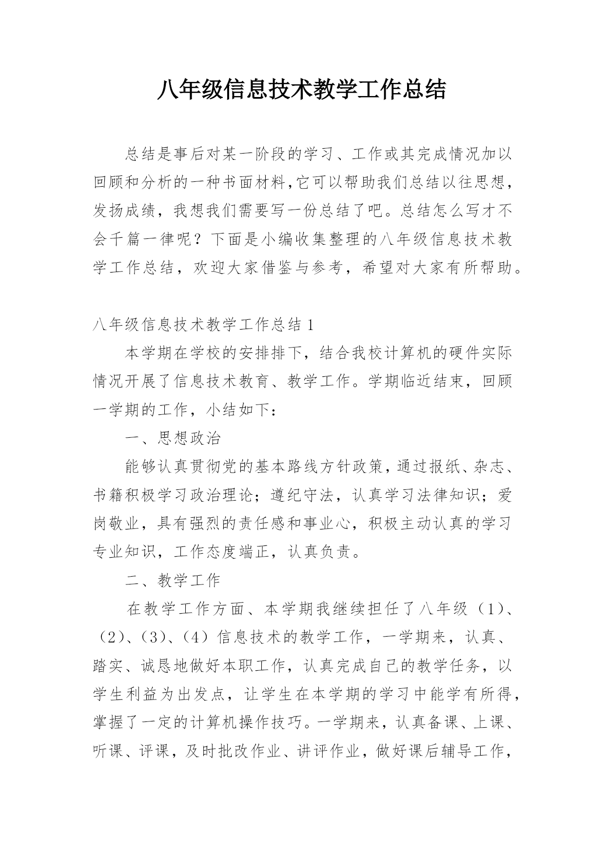 八年级信息技术教学工作总结总结是事后对某一阶段的学习、工作或其完成情况加以回顾和分析的一种书面材料,它可以帮助我们总结以往思想,发扬成绩,我想我们需要写一份总结了吧。总结怎么写才不会千篇一律呢?下面是小编收集整理的八年级信息技术教学工作总结,欢迎大家借鉴与参考,希望对大家有所帮助。八年级信息技术教学工作总结1本学期在学校的安排排下,结合我校计算机的硬件实际情况开展了信息技术教育、教学工作。学期临近结束,回顾一学期的工作,小结如下:一、思想政治能够认真贯彻党的基本路线方针政策,通过报纸、杂志、书籍积极学习政