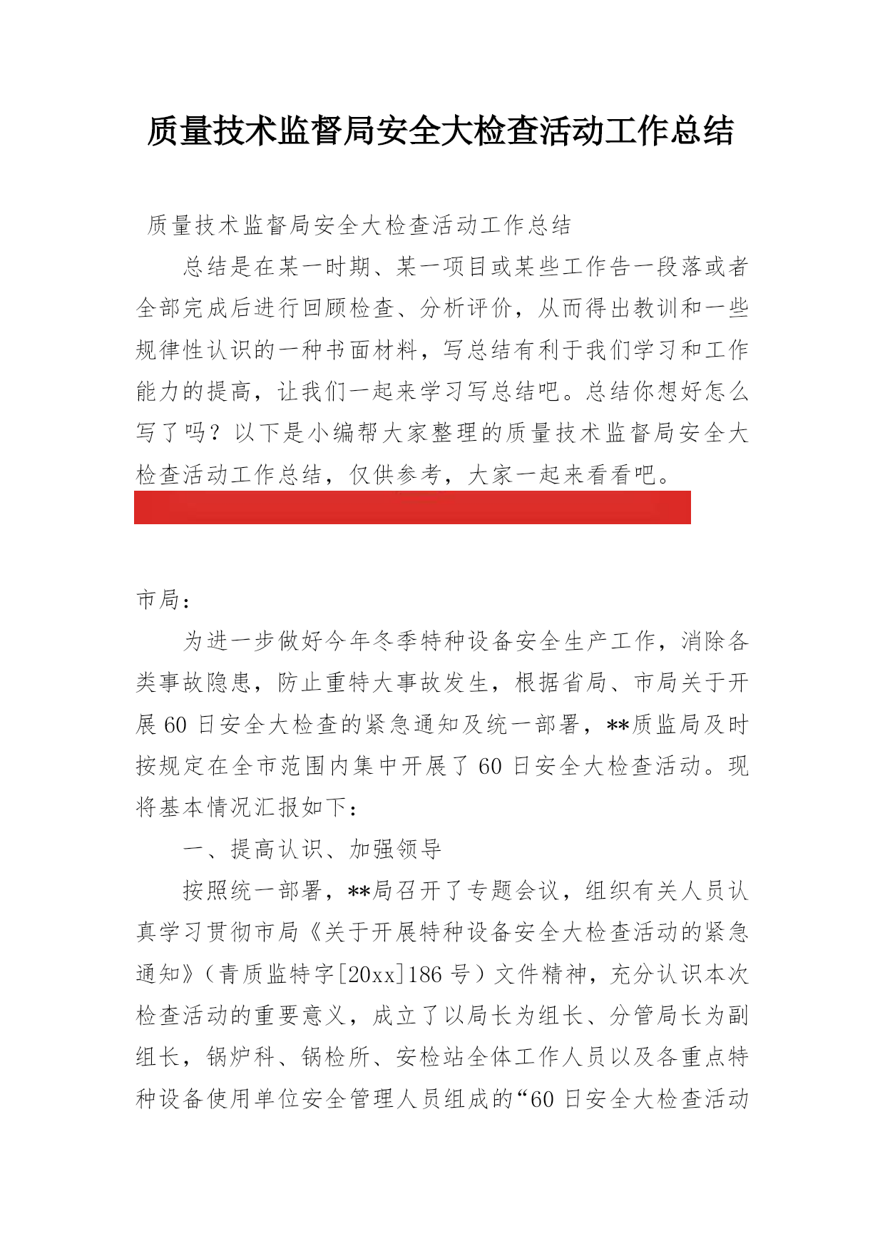 质量技术监督局安全大检查活动工作总结质量技术监督局安全大检查活动工作总结总结是在某一时期、某一项目或某些工作告一段落或者全部完成后进行回顾检查、分析评价,从而得出教训和一些规律性认识的一种书面材料,写总结有利于我们学习和工作能力的提高,让我们一起来学习写总结吧。总结你想好怎么写了吗?以下是小编帮大家整理的质量技术监督局安全大检查活动工作总结,仅供参考,大家一起来看看吧。市局:为进一步做好今年冬季特种设备安全生产工作,消除各类事故隐患,防止重特大事故发生,根据省局、市局关于开展60日安全大检查的紧急通知及统
