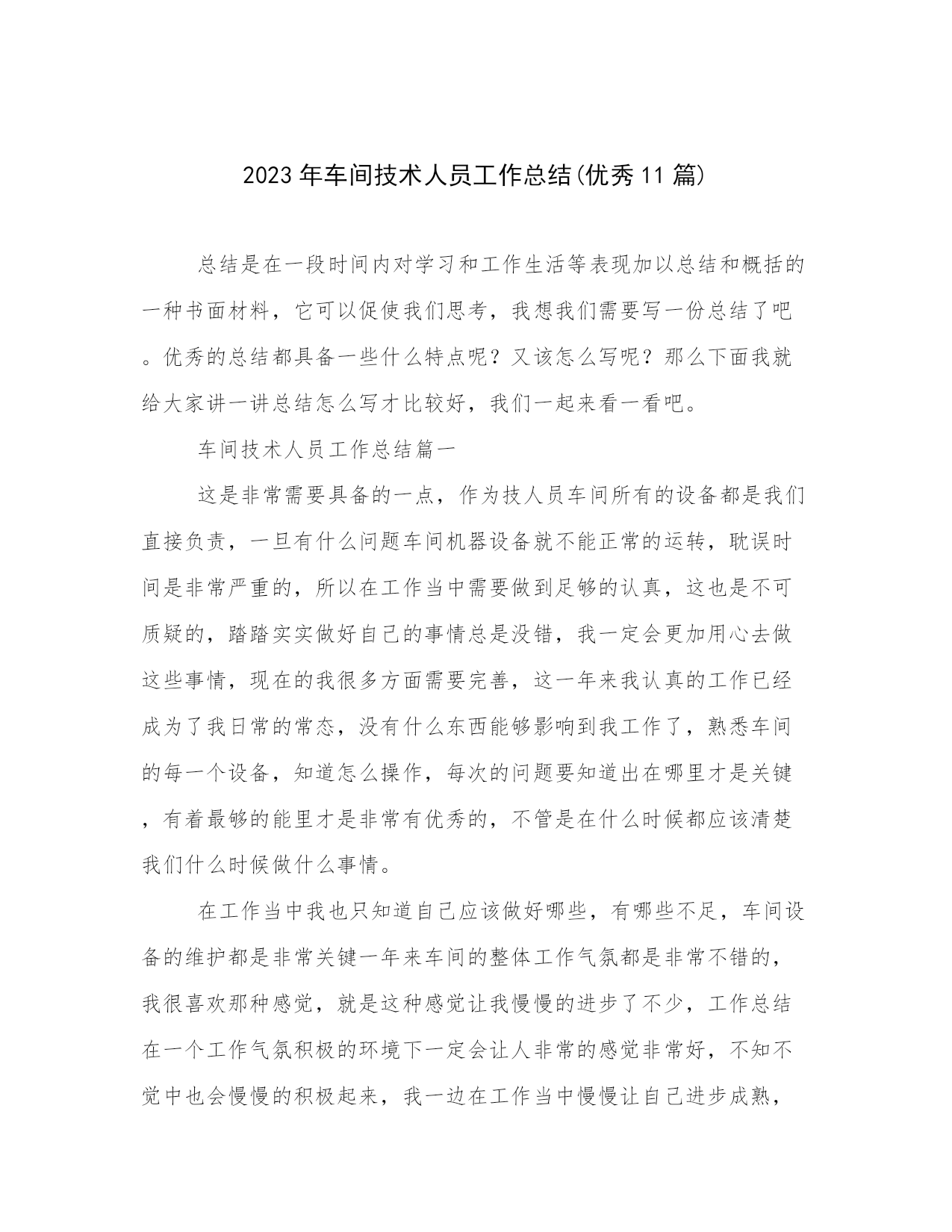 2023年车间技术人员工作总结(优秀11篇)总结是在一段时间内对学习和工作生活等表现加以总结和概括的一种书面材料,它可以促使我们思考,我想我们需要写一份总结了吧。优秀的总结都具备一些什么特点呢?又该怎么写呢?那么下面我就给大家讲一讲总结怎么写才比较好,我们一起来看一看吧。车间技术人员工作总结篇一这是非常需要具备的一点,作为技人员车间所有的设备都是我们直接负责,一旦有什么问题车间机器设备就不能正常的运转,耽误时间是非常严重的,所以在工作当中需要做到足够的认真,这也是不可质疑的,踏踏实实做好自己的事情总是没错