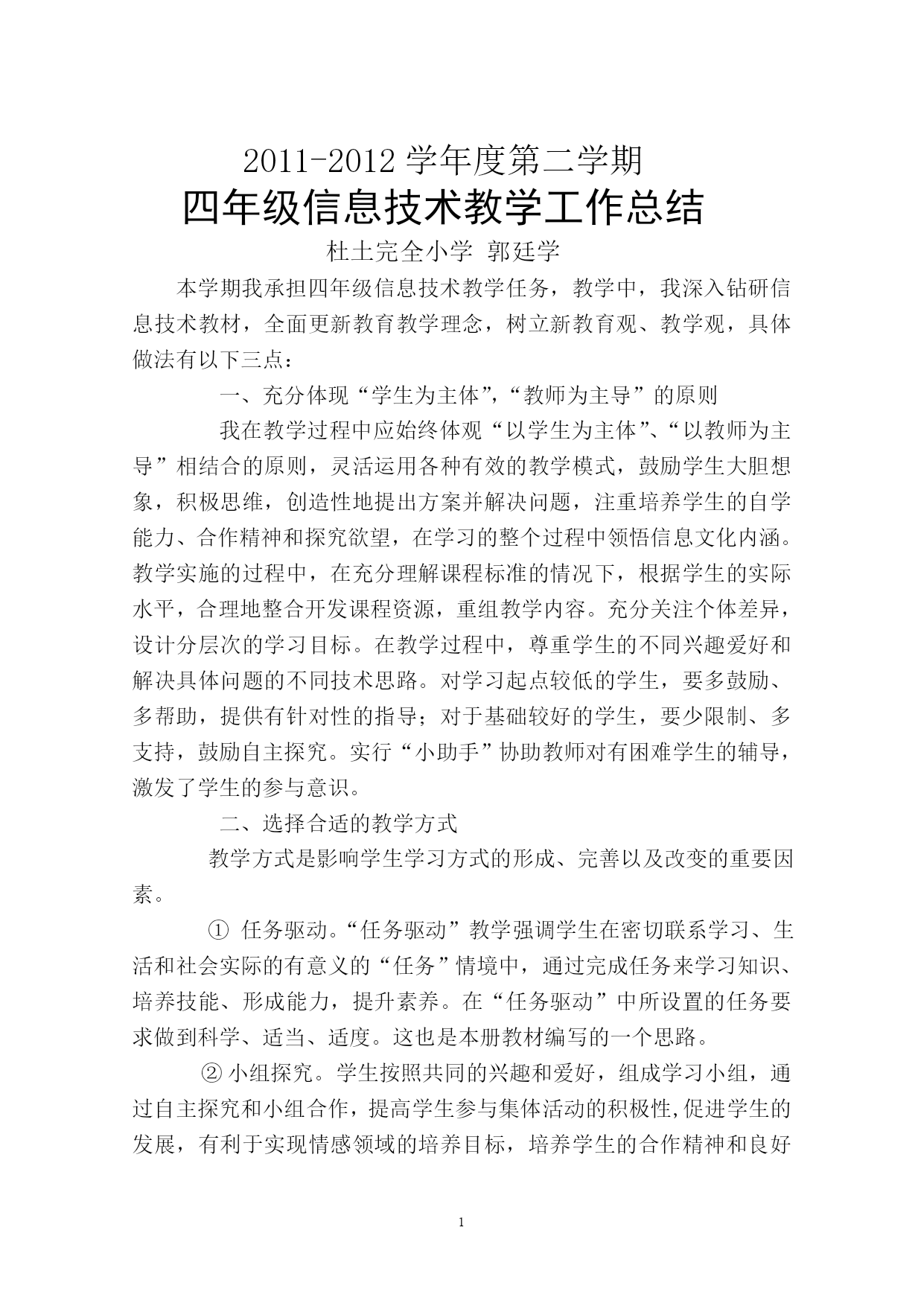 PAGEPAGE22011-2012学年度第二学期四年级信息技术教学工作总结杜土完全小学郭廷学本学期我承担四年级信息技术教学任务,教学中,我深入钻研信息技术教材,全面更新教育教学理念,树立新教育观、教学观,具体做法有以下三点:一、充分体现“学生为主体”,“教师为主导”的原则我在教学过程中应始终体观“以学生为主体”、“以教师为主导”相结合的原则,灵活运用各种有效的教学模式,鼓励学生大胆想象,积极思维,创造性地提出方案并解决问题,注重培养学生的自学能力、合作精神和探究欲望,在学习的整个过程中领悟信