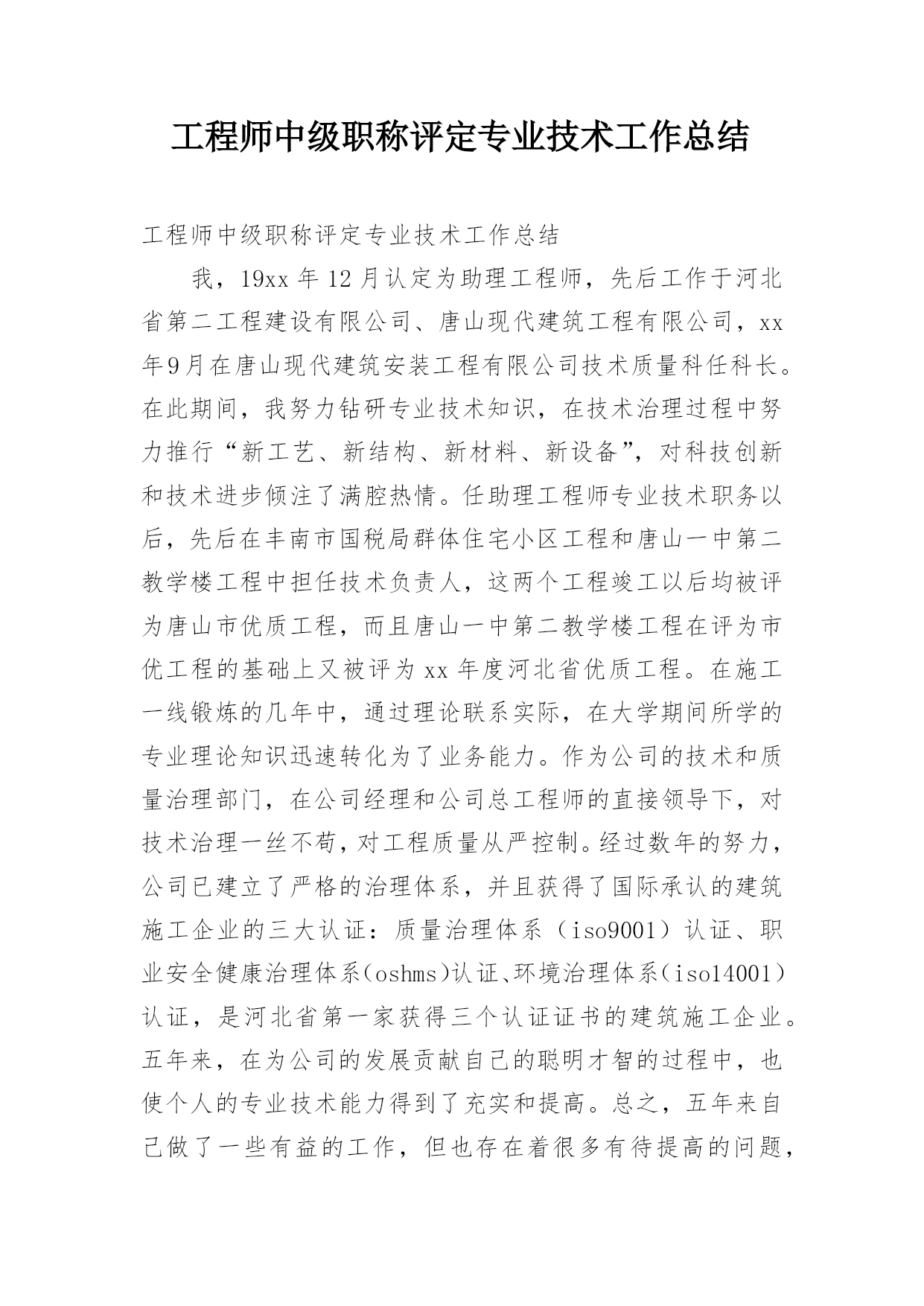 工程师中级职称评定专业技术工作总结工程师中级职称评定专业技术工作总结我,19xx年12月认定为助理工程师,先后工作于河北省第二工程建设有限公司、唐山现代建筑工程有限公司,xx年9月在唐山现代建筑安装工程有限公司技术质量科任科长。在此期间,我努力钻研专业技术知识,在技术治理过程中努力推行“新工艺、新结构、新材料、新设备”,对科技创新和技术进步倾注了满腔热情。任助理工程师专业技术职务以后,先后在丰南市国税局群体住宅小区工程和唐山一中第二教学楼工程中担任技术负责人,这两个工程竣工以后均被评为唐山市优质工程,而且