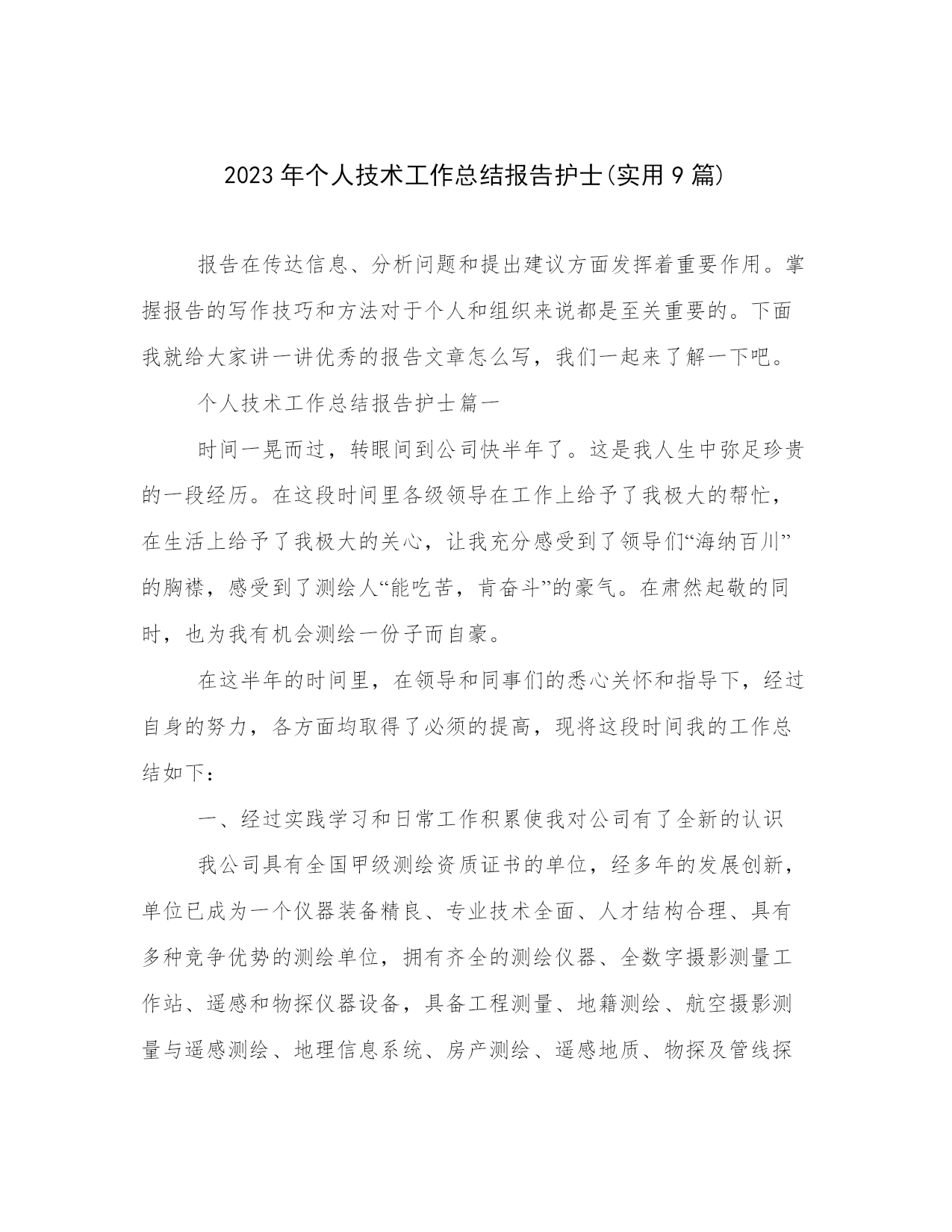 2023年个人技术工作总结报告护士(实用9篇).docx
