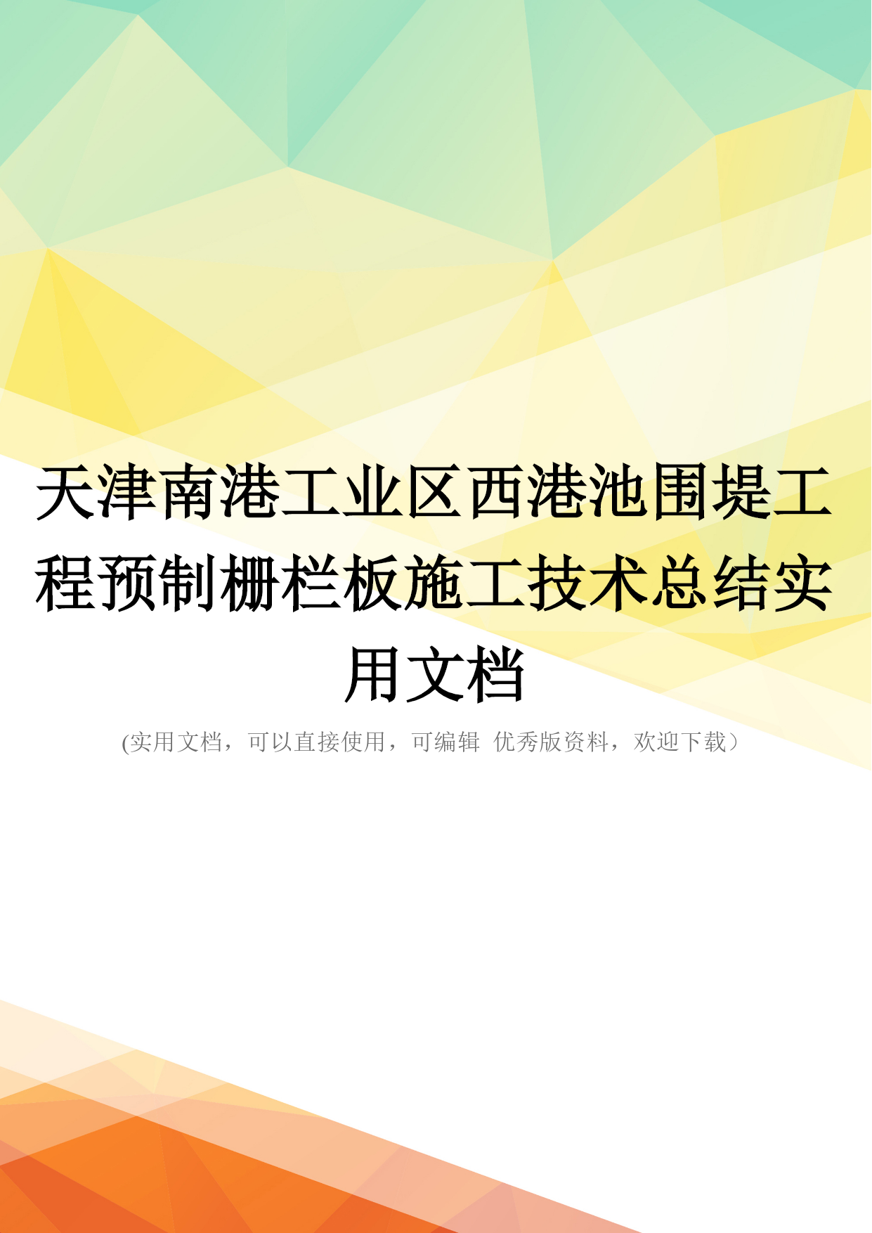 天津南港工业区西港池围堤工程预制栅栏板施工技术总结实用文档(实用文档,可以直接使用,可编辑优秀版资料,欢迎下载)天津南港工业区西港池围堤工程预制栅栏板施工技术总结第十六项目部李向龙张亮(中交一航局第一工程,天津塘沽,300456)摘要:为满足天津南港工业区围堰工程栅栏板预制安装,我们在临港产业区自有预制厂内进行预制,并结合公司以往栅栏板预制施工经验,针对该工艺进行了改进,在施工过程中解决了底部漏浆、应力集中处有气泡、麻面现象,避免钢筋保护层偏小等诸多问题,外观取得较好效果,对这一结构的预制施工简要介绍和经