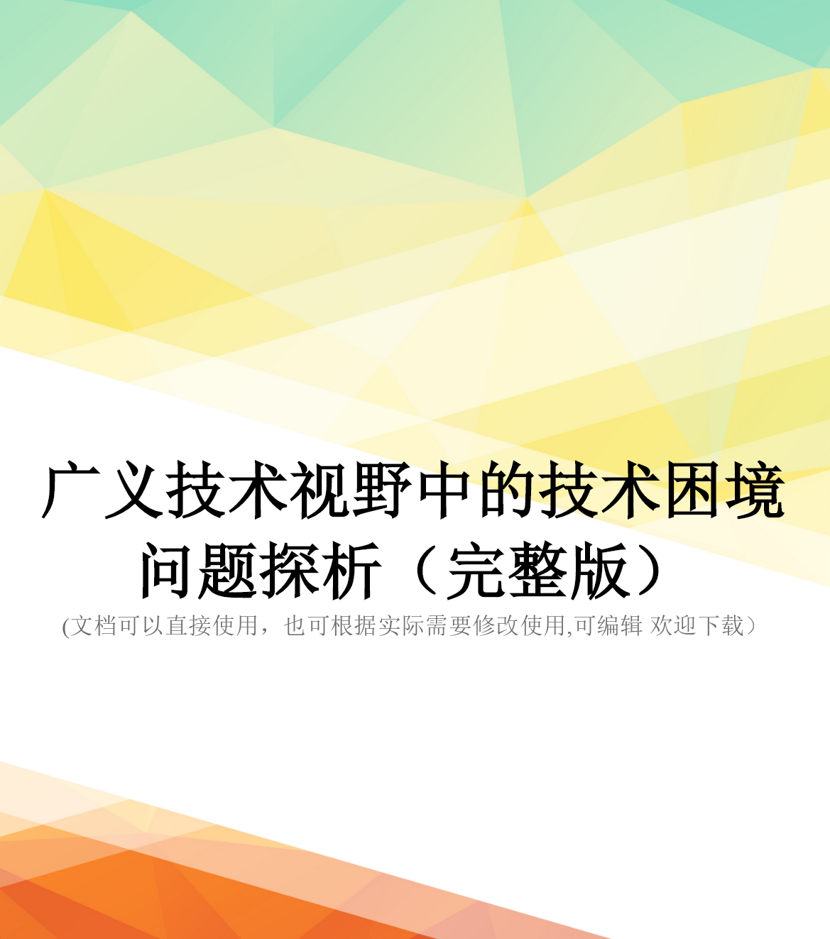 广义技术视野中的技术困境问题探析(完整版)(文档可以直接使用,也可根据实际需要修改使用,可编辑欢迎下载)广义技术视野中的技术困境问题探析王伯鲁(西南交通大学公共管理学院,四川成都610031)摘要:在广义技术视野中归纳和剖析了技术困境的五种类型与含义,简述了在人与技术关系问题上的主要分歧,探究了技术困境形成的根源,并展望了技术困境演变的前景。人是技术的动物,技术是人的基本属性,人类解放一直是在技术困境的“泥泞”中艰难前行的。关键词:技术哲学;广义技术观念;技术困境;根源;前景中图分类号:N031文献标识码