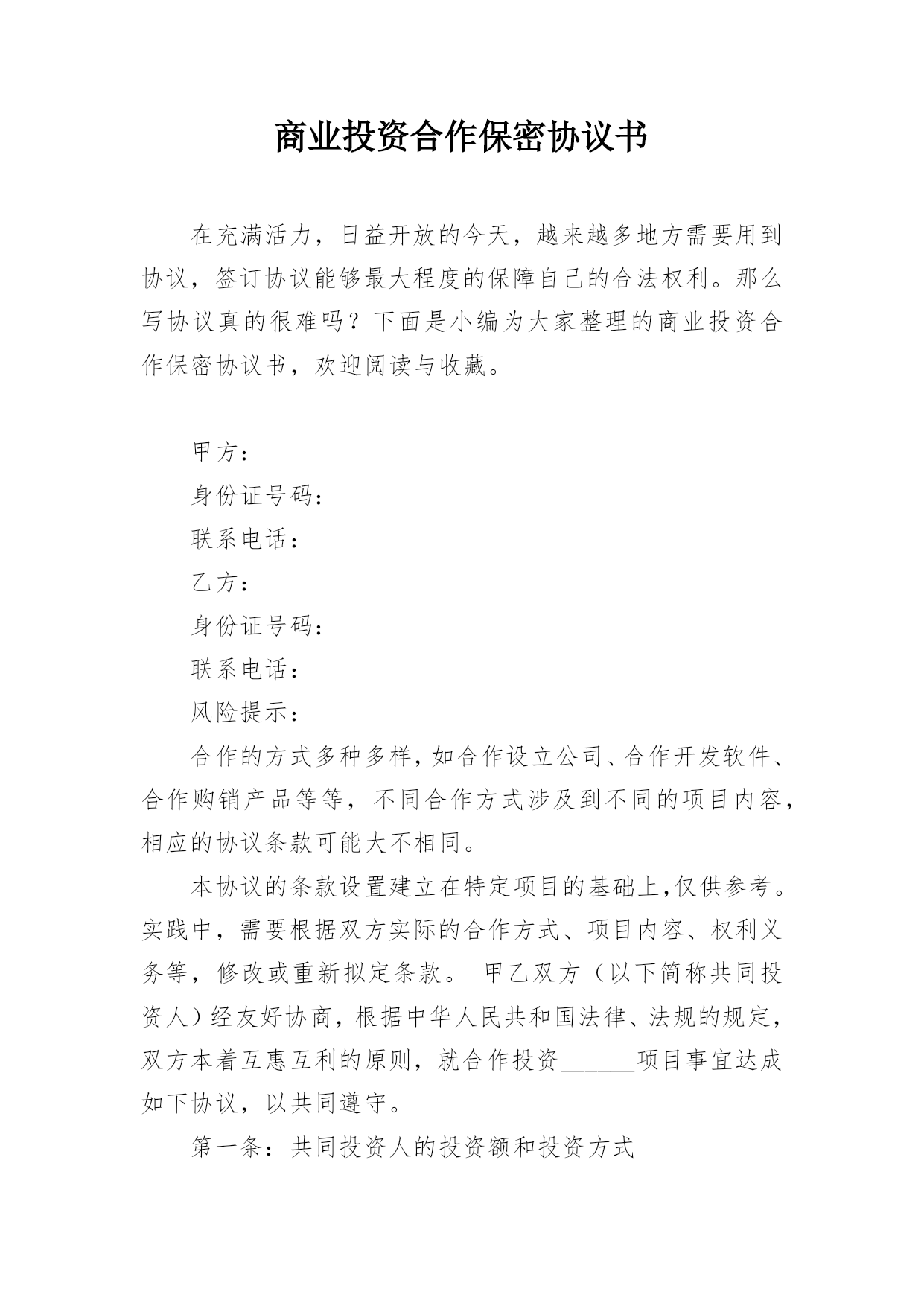 商业投资合作保密协议书在充满活力,日益开放的今天,越来越多地方需要用到协议,签订协议能够最大程度的保障自己的合法权利。那么写协议真的很难吗?下面是小编为大家整理的商业投资合作保密协议书,欢迎阅读与收藏。甲方:身份证号码:联系电话:乙方:身份证号码:联系电话:风险提示:合作的方式多种多样,如合作设立公司、合作开发软件、合作购销产品等等,不同合作方式涉及到不同的项目内容,相应的协议条款可能大不相同。本协议的条款设置建立在特定项目的基础上,仅供参考。实践中,需要根据双方实际的合作方式、项目内容、权利义务等,修改