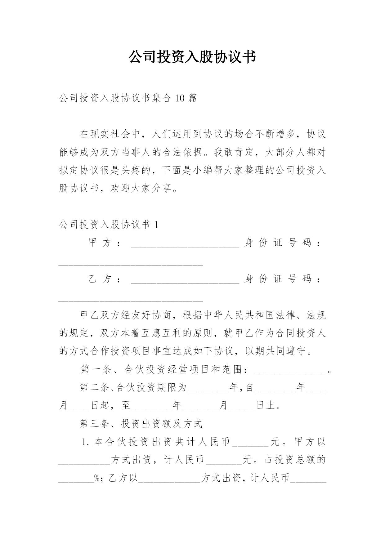 公司投资入股协议书公司投资入股协议书集合10篇在现实社会中,人们运用到协议的场合不断增多,协议能够成为双方当事人的合法依据。我敢肯定,大部分人都对拟定协议很是头疼的,下面是小编帮大家整理的公司投资入股协议书,欢迎大家分享。公司投资入股协议书1甲方:_____________________身份证号码:____________________________乙方:_____________________身份证号码:____________________________甲乙双方经友好协商,根据中华人民共和