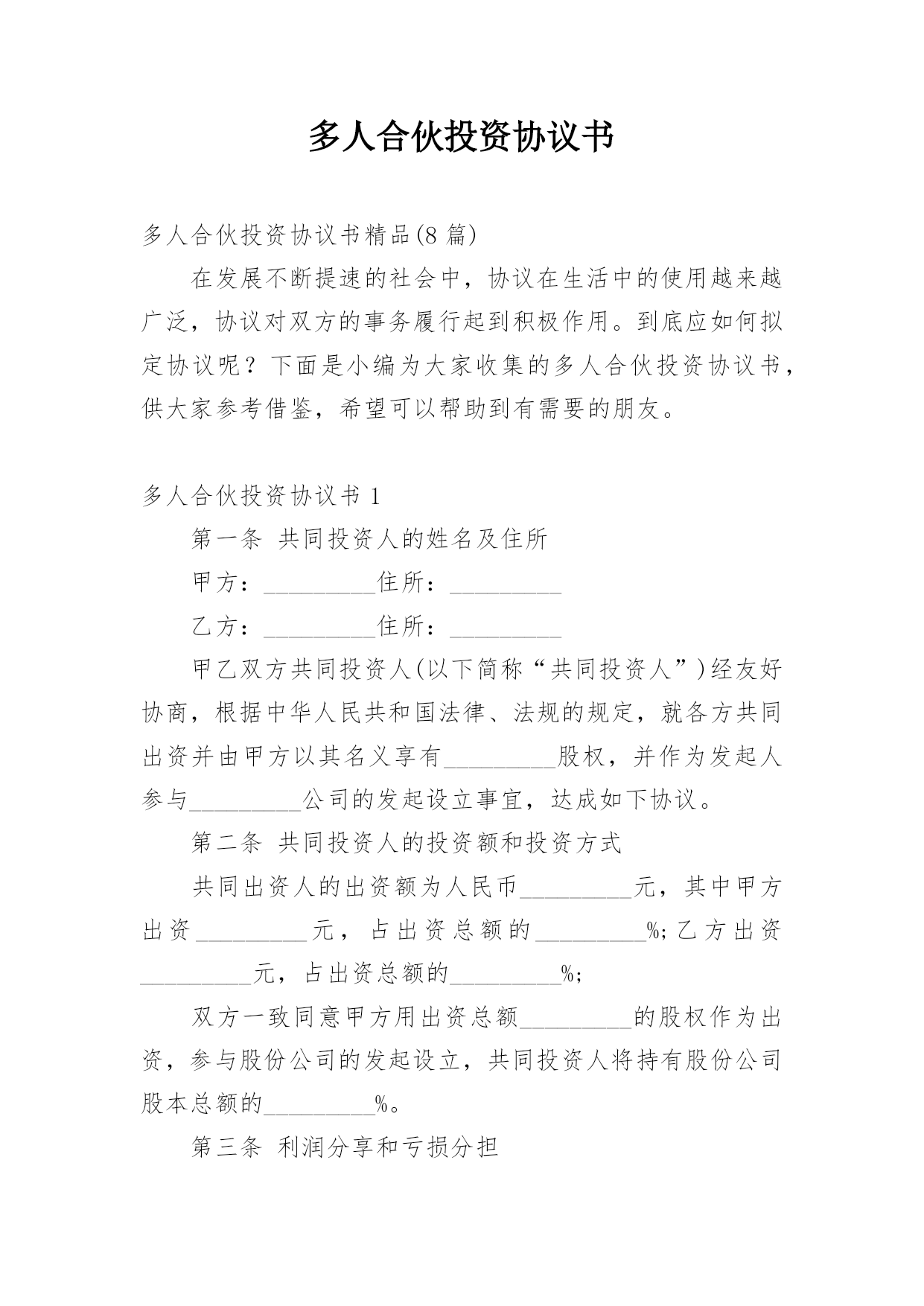 多人合伙投资协议书多人合伙投资协议书精品(8篇)在发展不断提速的社会中,协议在生活中的使用越来越广泛,协议对双方的事务履行起到积极作用。到底应如何拟定协议呢?下面是小编为大家收集的多人合伙投资协议书,供大家参考借鉴,希望可以帮助到有需要的朋友。多人合伙投资协议书1第一条共同投资人的姓名及住所甲方:_________住所:_________乙方:_________住所:_________甲乙双方共同投资人(以下简称“共同投资人”)经友好协商,根据中华人民共和国法律、法规的规定,就各方共同出资并由甲方以其名义