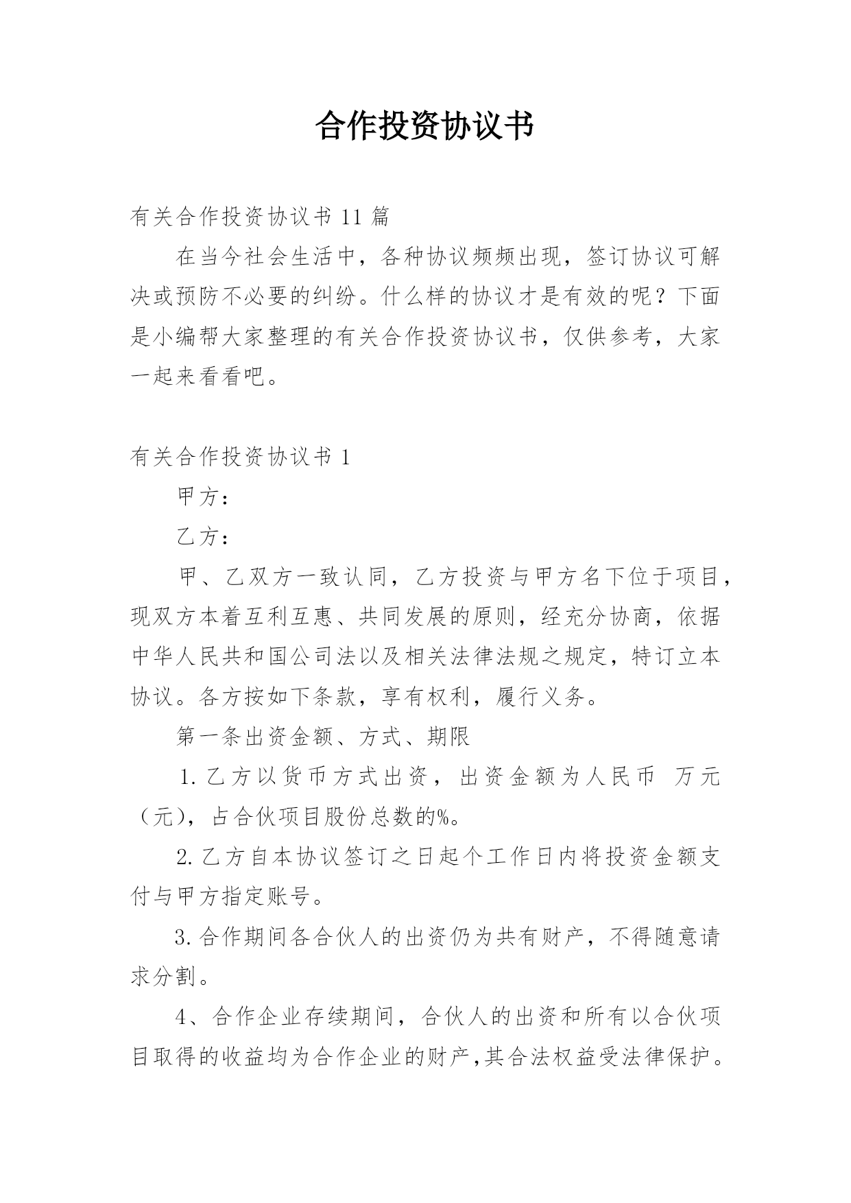 合作投资协议书有关合作投资协议书11篇在当今社会生活中,各种协议频频出现,签订协议可解决或预防不必要的纠纷。什么样的协议才是有效的呢?下面是小编帮大家整理的有关合作投资协议书,仅供参考,大家一起来看看吧。有关合作投资协议书1甲方:乙方:甲、乙双方一致认同,乙方投资与甲方名下位于项目,现双方本着互利互惠、共同发展的原则,经充分协商,依据中华人民共和国公司法以及相关法律法规之规定,特订立本协议。各方按如下条款,享有权利,履行义务。第一条出资金额、方式、期限1.乙方以货币方式出资,出资金额为人民币万元(元),占