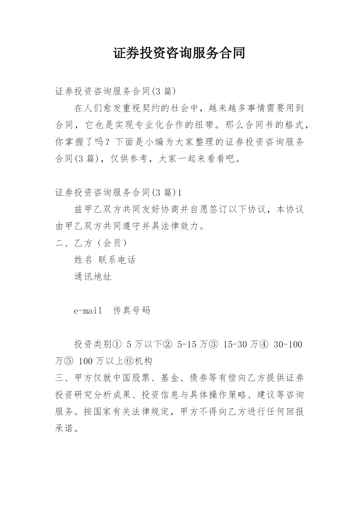 证券投资咨询服务合同证券投资咨询服务合同(3篇)在人们愈发重视契约的社会中,越来越多事情需要用到合同,它也是实现专业化合作的纽带。那么合同书的格式,你掌握了吗?下面是小编为大家整理的证券投资咨询服务合同(3篇),仅供参考,大家一起来看看吧。证券投资咨询服务合同(3篇)1兹甲乙双方共同友好协商并自愿签订以下协议,本协议由甲乙双方共同遵守并具法律效力。二、乙方(会员)姓名联系电话通讯地址e-mail传真号码投资类别①5万以下②5-15万③15-30万④30-100万⑤100万以上⑥机构三、甲方仅就中国股票、基