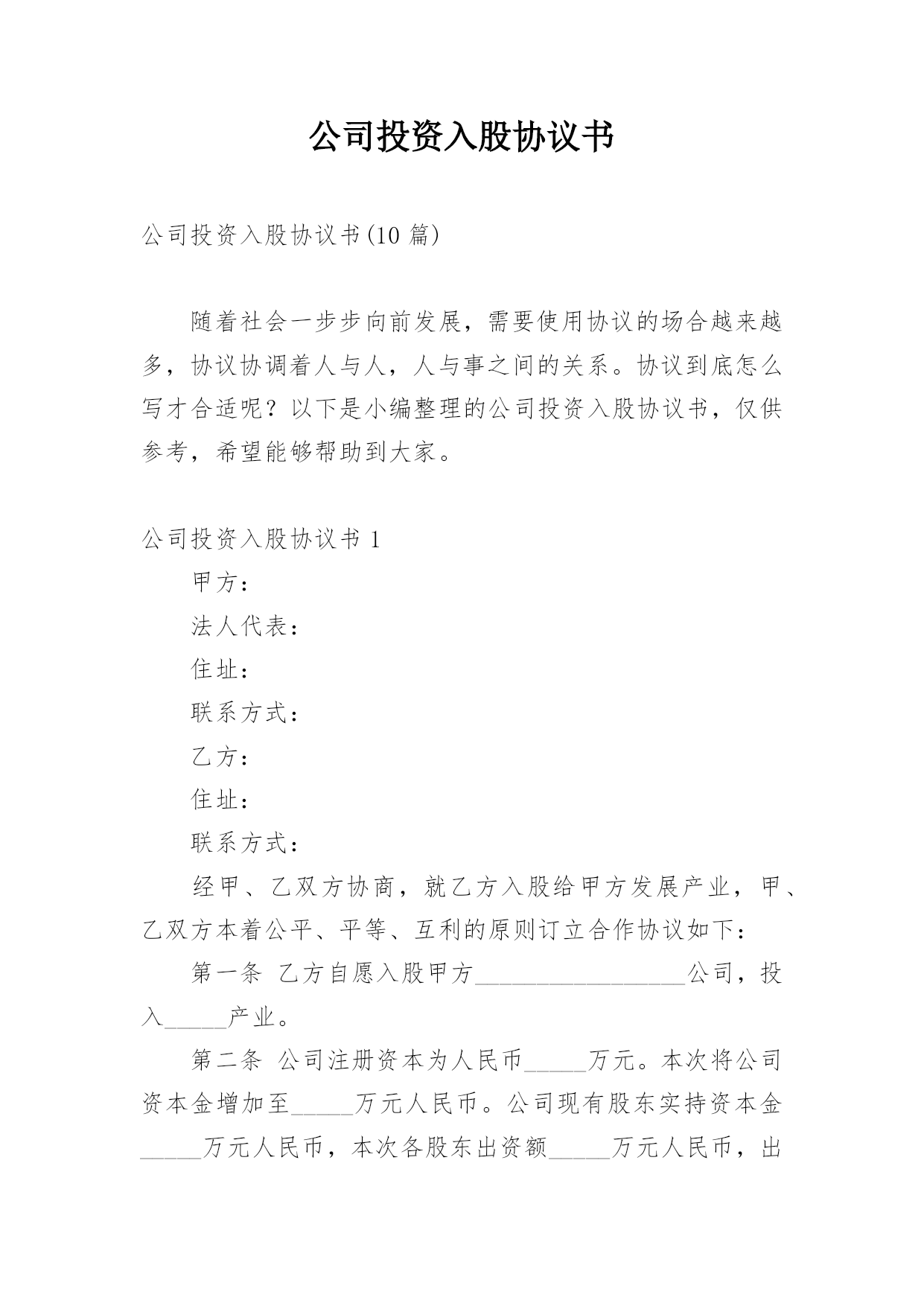公司投资入股协议书公司投资入股协议书(10篇)随着社会一步步向前发展,需要使用协议的场合越来越多,协议协调着人与人,人与事之间的关系。协议到底怎么写才合适呢?以下是小编整理的公司投资入股协议书,仅供参考,希望能够帮助到大家。公司投资入股协议书1甲方:法人代表:住址:联系方式:乙方:住址:联系方式:经甲、乙双方协商,就乙方入股给甲方发展产业,甲、乙双方本着公平、平等、互利的原则订立合作协议如下:第一条乙方自愿入股甲方_________________公司,投入_____产业。第二条公司注册资本为人民币___