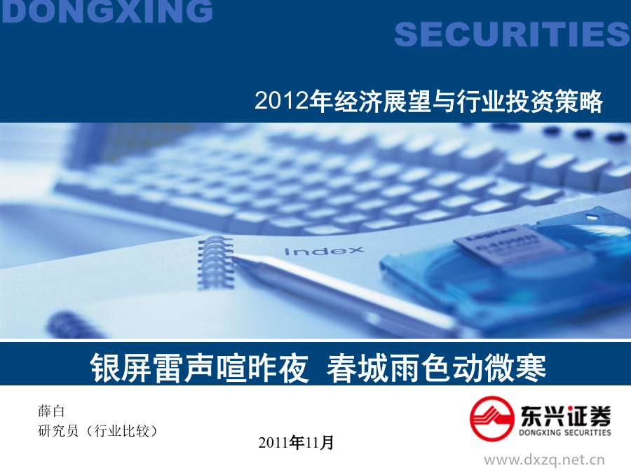 研究领域:宏观、行业比较Phone:010-66554044/15901175156MSN:xuebaieco@yahoo.cn1.宏观经济展望2.行业投资主线3.行业投资策略2012年到期债务规模占全部债务:希腊10.15%意大利11.49%西班牙12.01%葡萄牙8.06%爱尔兰7.65%美国复苏困难重重,但二次衰退可能性小2012年出口增长可达20%左右2012年二季度后进入周期性复苏2012年二季度后进入周期性复苏“十二五”中国经济增速中枢在9%上下资源价格和经济复苏推动下半年通胀上行通胀回落和政