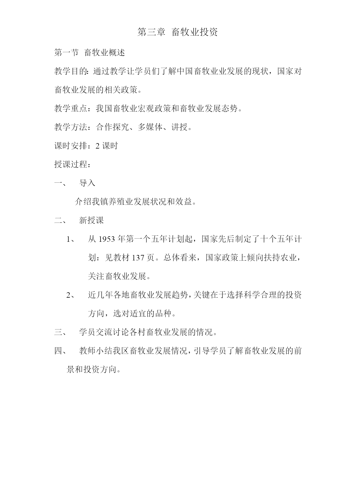 第三章畜牧业投资畜牧业概述教学目的:通过教学让学员们了解中国畜牧业业发展的现状,国家对畜牧业发展的相关政策。教学重点:我国畜牧业宏观政策和畜牧业发展态势。教学方法:合作探究、多媒体、讲授。课时安排:2课时授课过程:导入介绍我镇养殖业发展状况和效益。新授课从1953年第一个五年计划起,国家先后制定了十个五年计划:见教材137页。总体看来,国家政策上倾向扶持农业,关注畜牧业发展。近几年各地畜牧业发展趋势,关键在于选择科学合理的投资方向,选对适宜的品种。学员交流讨论各村畜牧业发展的情况。教师小结我区畜牧业发展情
