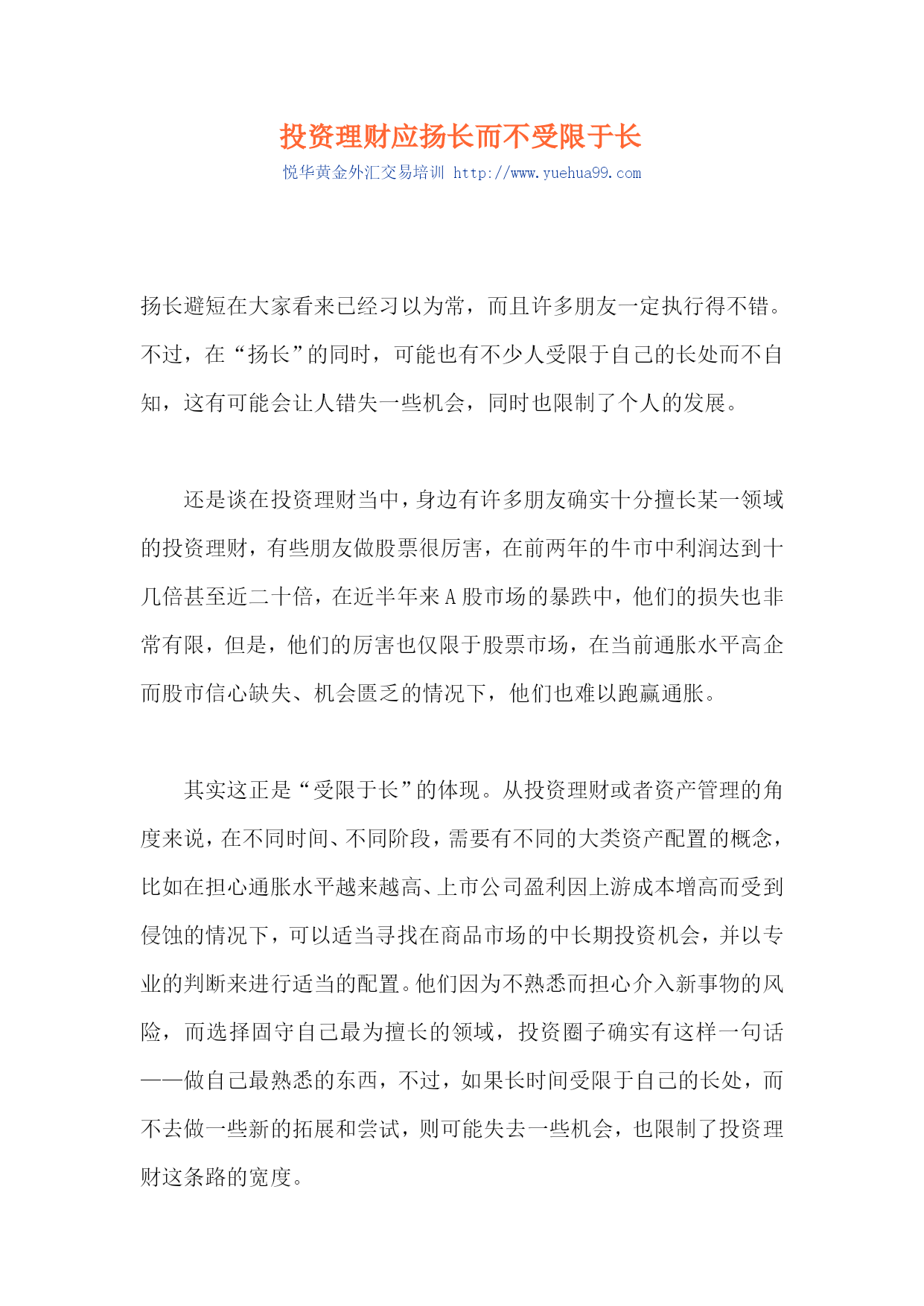 投资理财应扬长而不受限于长HYPERLINK"http://www.yuehua99.com"悦华黄金外汇交易培训http://www.yuehua99.com扬长避短在大家看来已经习以为常,而且许多朋友一定执行得不错。不过,在“扬长”的同时,可能也有不少人受限于自己的长处而不自知,这有可能会让人错失一些机会,同时也限制了个人的发展。还是谈在投资理财当中,身边有许多朋友确实十分擅长某一领域的投资理财,有些朋友做股票很厉害,在前两年的牛市中利润达到十几倍甚至近二十倍,在近半年来A股市场的暴跌中,他们的