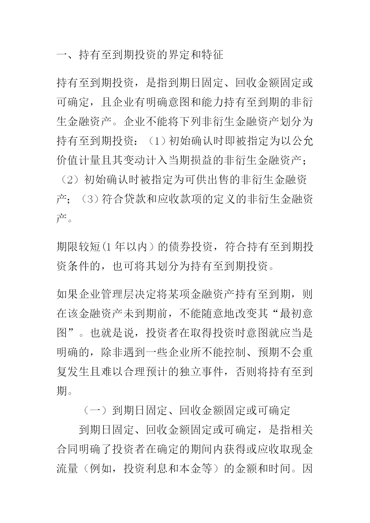 一、持有至到期投资的界定和特征持有至到期投资,是指到期日固定、回收金额固定或可确定,且企业有明确意图和能力持有至到期的非衍生金融资产。企业不能将下列非衍生金融资产划分为持有至到期投资:(1)初始确认时即被指定为以公允价值计量且其变动计入当期损益的非衍生金融资产;(2)初始确认时被指定为可供出售的非衍生金融资产;(3)符合贷款和应收款项的定义的非衍生金融资产。期限较短(1年以内)的债券投资,符合持有至到期投资条件的,也可将其划分为持有至到期投资。如果企业管理层决定将某项金融资产持有至到期,则在该金融资产未到