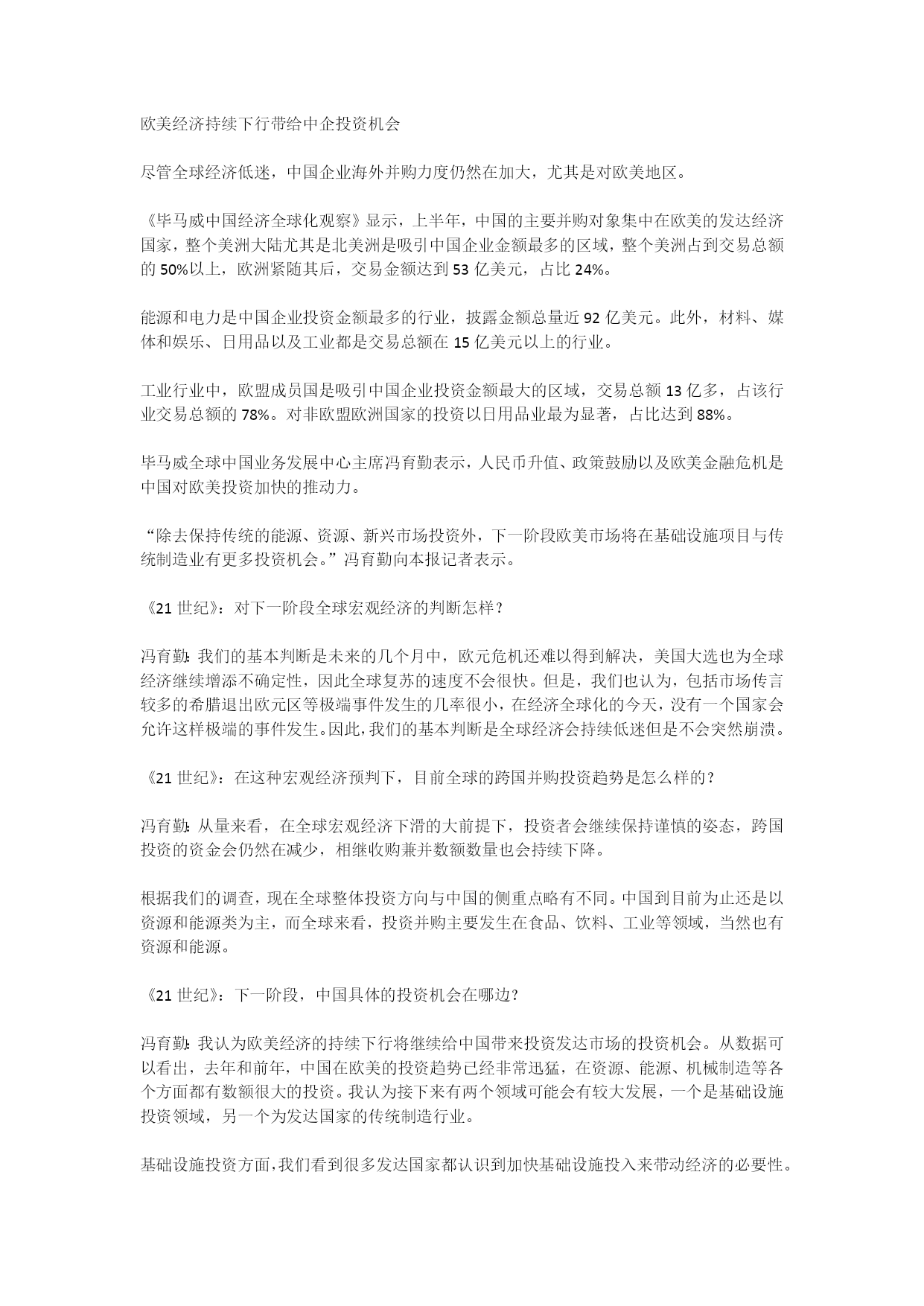 欧美经济持续下行带给中企投资机会尽管全球经济低迷,中国企业海外并购力度仍然在加大,尤其是对欧美地区。《毕马威中国经济全球化观察》显示,上半年,中国的主要并购对象集中在欧美的发达经济国家,整个美洲大陆尤其是北美洲是吸引中国企业金额最多的区域,整个美洲占到交易总额的50%以上,欧洲紧随其后,交易金额达到53亿美元,占比24%。能源和电力是中国企业投资金额最多的行业,披露金额总量近92亿美元。此外,材料、媒体和娱乐、日用品以及工业都是交易总额在15亿美元以上的行业。工业行业中,欧盟成员国是吸引中国企业投资金额最