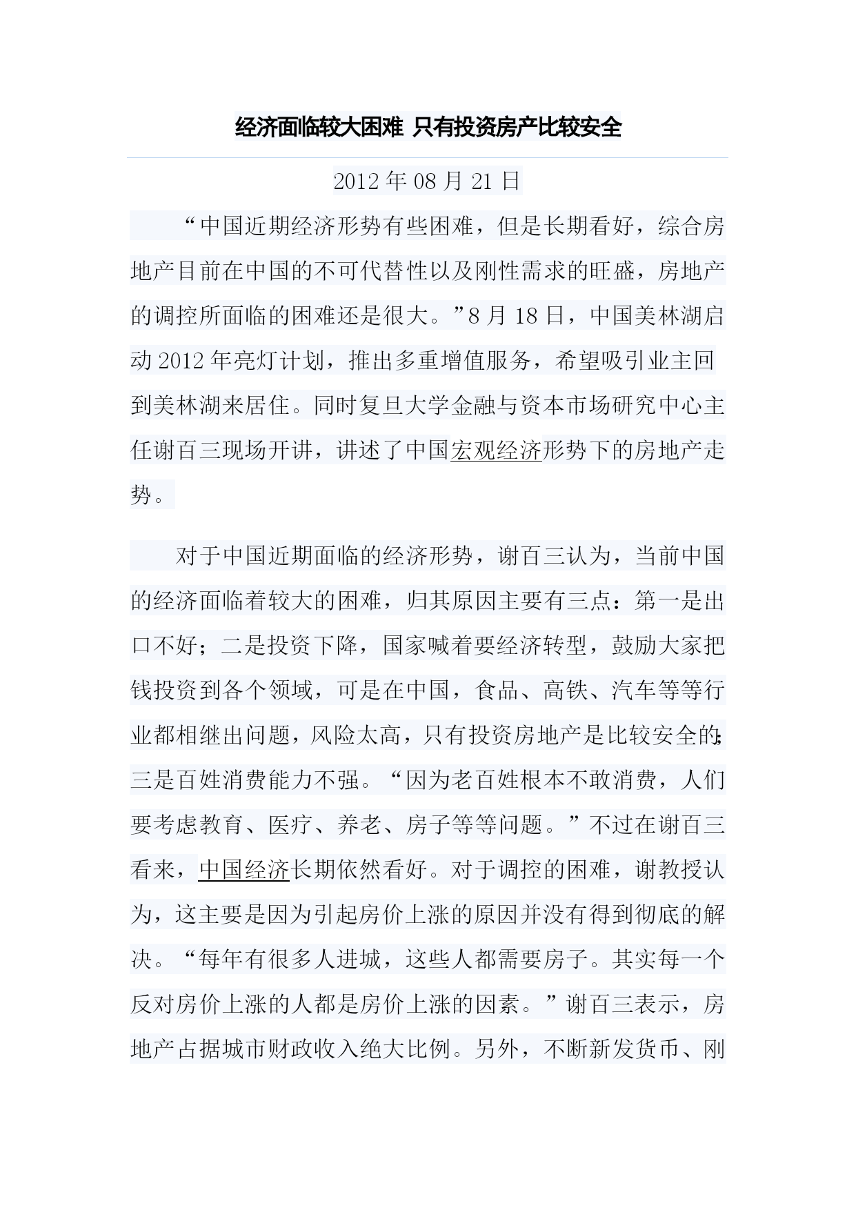 经济面临较大困难只有投资房产比较安全2012年08月21日“中国近期经济形势有些困难,但是长期看好,综合房地产目前在中国的不可代替性以及刚性需求的旺盛,房地产的调控所面临的困难还是很大。”8月18日,中国美林湖启动2012年亮灯计划,推出多重增值服务,希望吸引业主回到美林湖来居住。同时复旦大学金融与资本市场研究中心主任谢百三现场开讲,讲述了中国HYPERLINK"http://topic.eastmoney.com/HGSJ201205/"\t"_blank"宏观经济形势下的房地产走势。对于中国近期