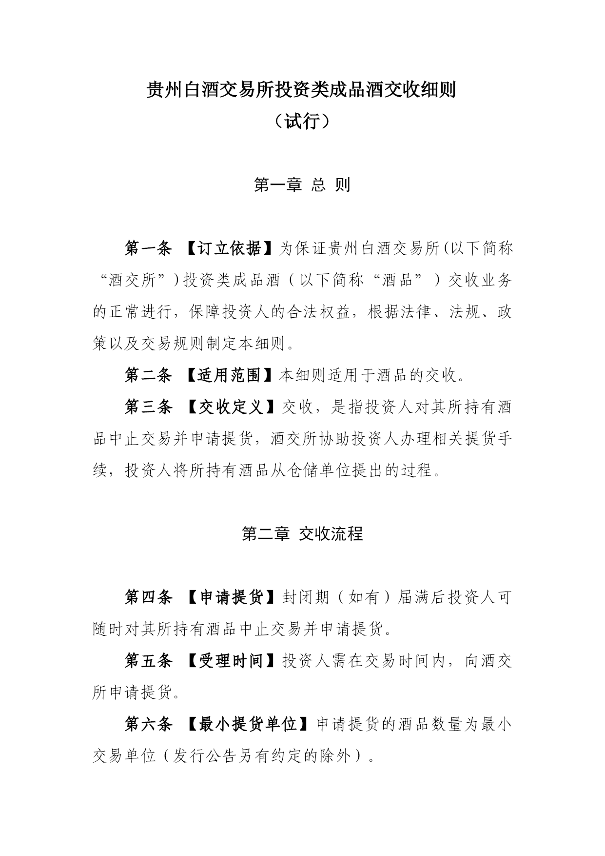 贵州白酒交易所投资类成品酒交收细则(试行)第一章总则第一条【订立依据】为保证贵州白酒交易所(以下简称“酒交所”)投资类成品酒(以下简称“酒品”)交收业务的正常进行,保障投资人的合法权益,根据法律、法规、政策以及交易规则制定本细则。第二条【适用范围】本细则适用于酒品的交收。第三条【交收定义】交收,是指投资人对其所持有酒品中止交易并申请提货,酒交所协助投资人办理相关提货手续,投资人将所持有酒品从仓储单位提出的过程。第二章交收流程第四条【申请提货】封闭期(如有)届满后投资人可随时对其所持有酒品中止交易并申请提货