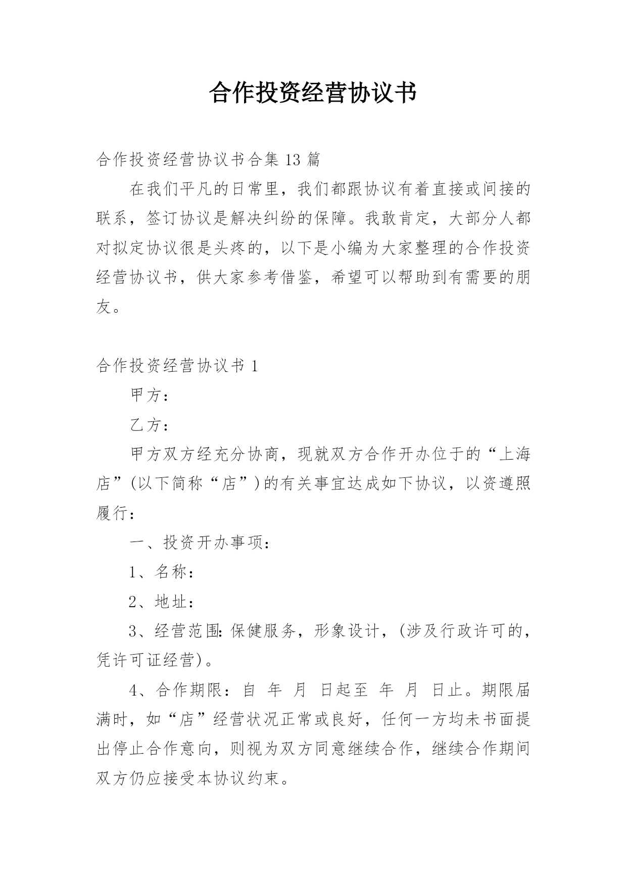 合作投资经营协议书合作投资经营协议书合集13篇在我们平凡的日常里,我们都跟协议有着直接或间接的联系,签订协议是解决纠纷的保障。我敢肯定,大部分人都对拟定协议很是头疼的,以下是小编为大家整理的合作投资经营协议书,供大家参考借鉴,希望可以帮助到有需要的朋友。合作投资经营协议书1甲方:乙方:甲方双方经充分协商,现就双方合作开办位于的“上海店”(以下简称“店”)的有关事宜达成如下协议,以资遵照履行:一、投资开办事项:1、名称:2、地址:3、经营范围:保健服务,形象设计,(涉及行政许可的,凭许可证经营)。4、合作期