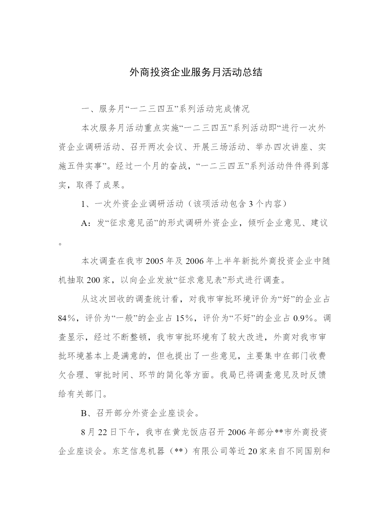 外商投资企业服务月活动总结一、服务月“一二三四五”系列活动完成情况本次服务月活动重点实施“一二三四五”系列活动即“进行一次外资企业调研活动、召开两次会议、开展三场活动、举办四次讲座、实施五件实事”。经过一个月的奋战,“一二三四五”系列活动件件得到落实,取得了成果。1、一次外资企业调研活动(该项活动包含3个内容)A:发“征求意见函”的形式调研外资企业,倾听企业意见、建议。本次调查在我市2005年及2006年上半年新批外商投资企业中随机抽取200家,以向企业发放“征求意见表”形式进行调查。从这次回收的调查统计