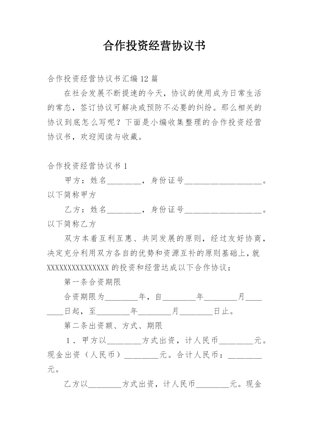合作投资经营协议书合作投资经营协议书汇编12篇在社会发展不断提速的今天,协议的使用成为日常生活的常态,签订协议可解决或预防不必要的纠纷。那么相关的协议到底怎么写呢?下面是小编收集整理的合作投资经营协议书,欢迎阅读与收藏。合作投资经营协议书1甲方:姓名____,身份证号_________。以下简称甲方乙方:姓名____,身份证号_________。以下简称乙方双方本着互利互惠、共同发展的原则,经过友好协商,决定充分利用双方各自的优势和资源互补的原则基础上,就XXXXXXXXXXXXXXX的投资和经营达成以下