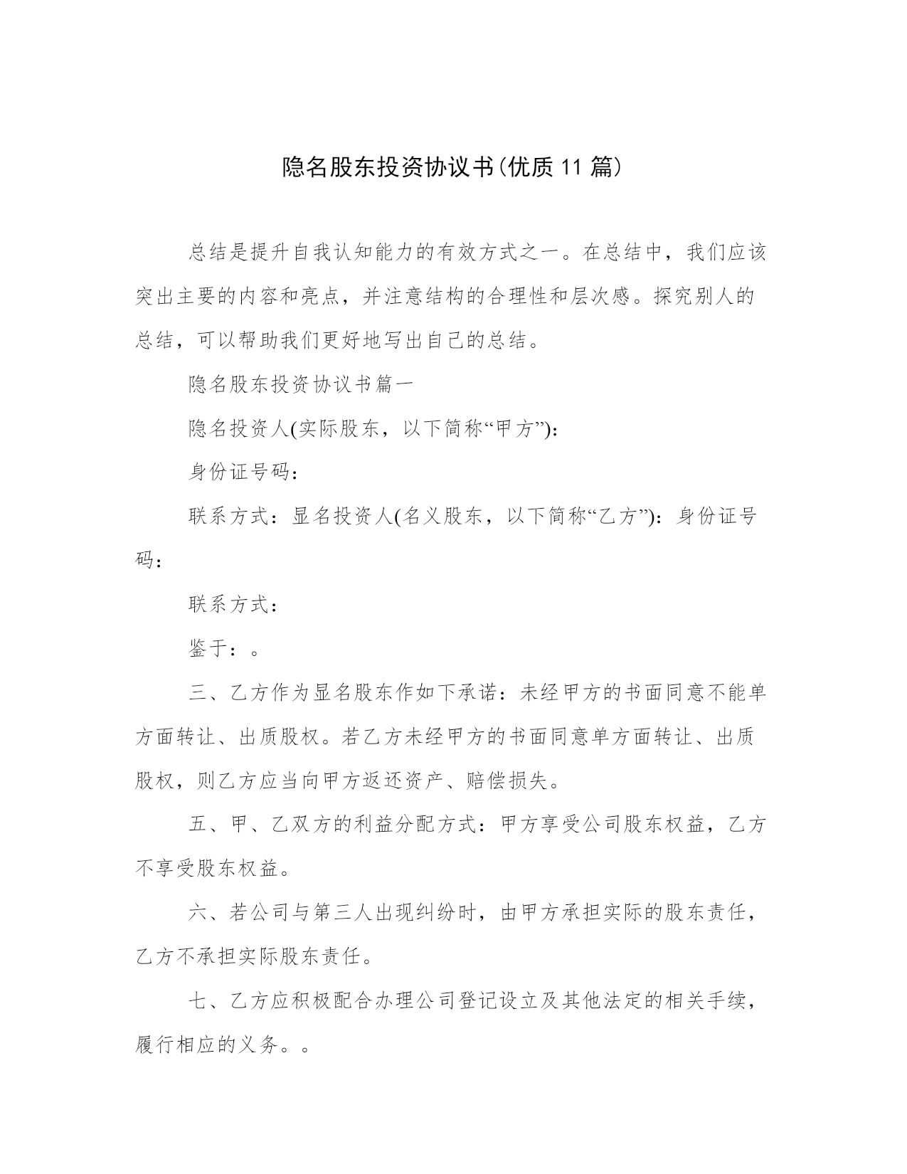 隐名股东投资协议书(优质11篇)总结是提升自我认知能力的有效方式之一。在总结中,我们应该突出主要的内容和亮点,并注意结构的合理性和层次感。探究别人的总结,可以帮助我们更好地写出自己的总结。隐名股东投资协议书篇一隐名投资人(实际股东,以下简称“甲方”):身份证号码:联系方式:显名投资人(名义股东,以下简称“乙方”):身份证号码:联系方式:鉴于:。三、乙方作为显名股东作如下承诺:未经甲方的书面同意不能单方面转让、出质股权。若乙方未经甲方的书面同意单方面转让、出质股权,则乙方应当向甲方返还资产、赔偿损失。五、甲