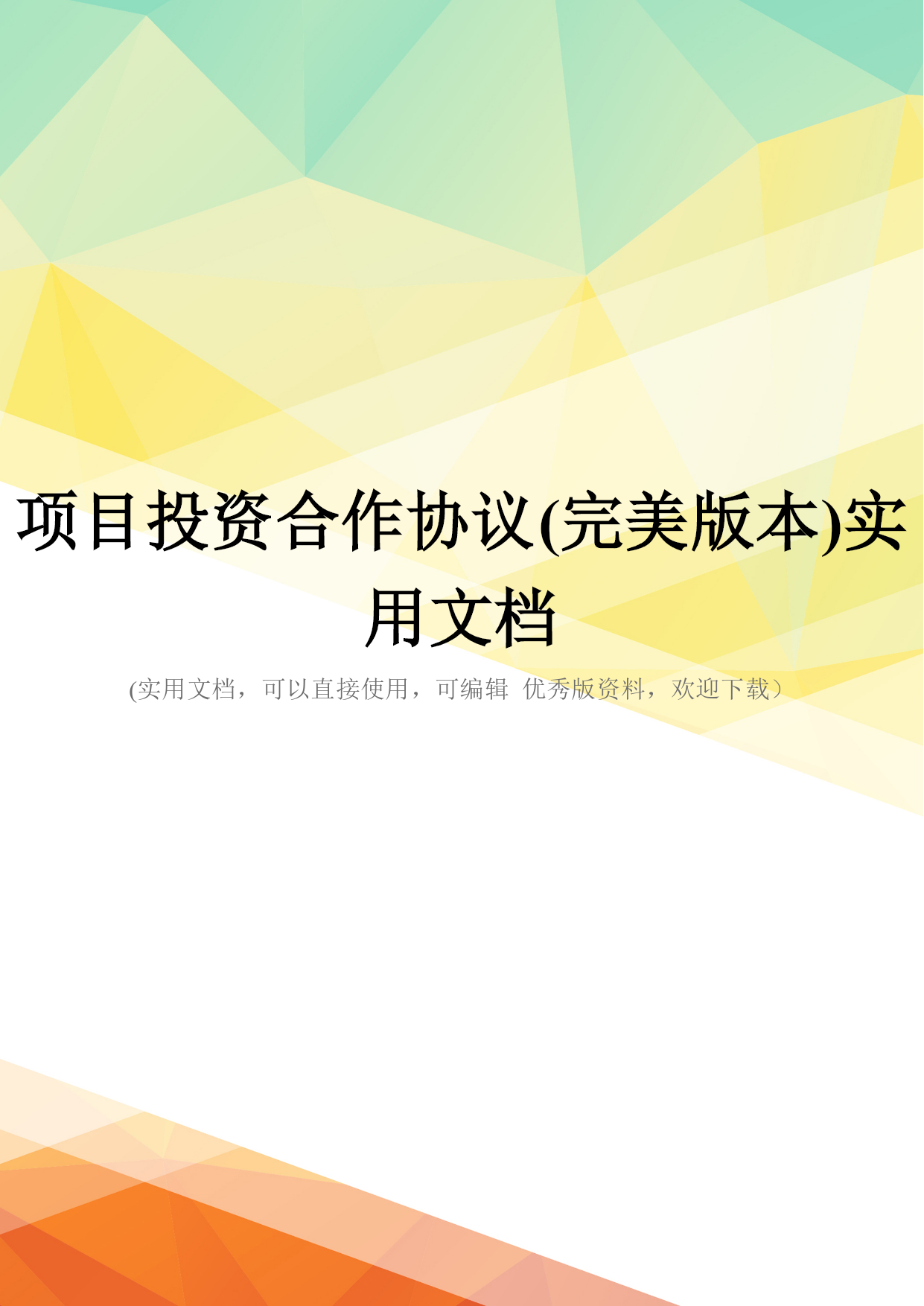 项目投资合作协议(完美版本)实用文档(实用文档,可以直接使用,可编辑优秀版资料,欢迎下载)建筑工程项目投资合作协议甲方:(以下简称甲方).乙方:,身份证号码:(以下简称乙方)。丙方(乙方的担保人):,身份证号码:(以下简称丙方).根据《中华人民共和国合同法》、《中华人民共和国建筑法》及其他有关法律、行政法规的规定,经甲、乙、丙三方友好协商,遵循平等、自愿、公平和诚实信用、互惠互利的原则,双方就项目投资合作事宜达成如下协议,共同遵守。第一章项目概况及合作条件第一条工程项目概况1。1本工程项目名称:1。2本工