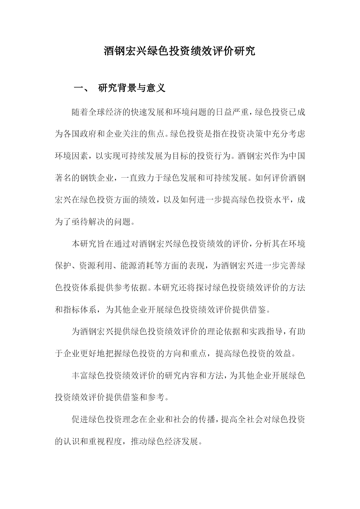 酒钢宏兴绿色投资绩效评价研究一、研究背景与意义随着全球经济的快速发展和环境问题的日益严重,绿色投资已成为各国政府和企业关注的焦点。绿色投资是指在投资决策中充分考虑环境因素,以实现可持续发展为目标的投资行为。酒钢宏兴作为中国著名的钢铁企业,一直致力于绿色发展和可持续发展。如何评价酒钢宏兴在绿色投资方面的绩效,以及如何进一步提高绿色投资水平,成为了亟待解决的问题。本研究旨在通过对酒钢宏兴绿色投资绩效的评价,分析其在环境保护、资源利用、能源消耗等方面的表现,为酒钢宏兴进一步完善绿色投资体系提供参考依据。本研究还
