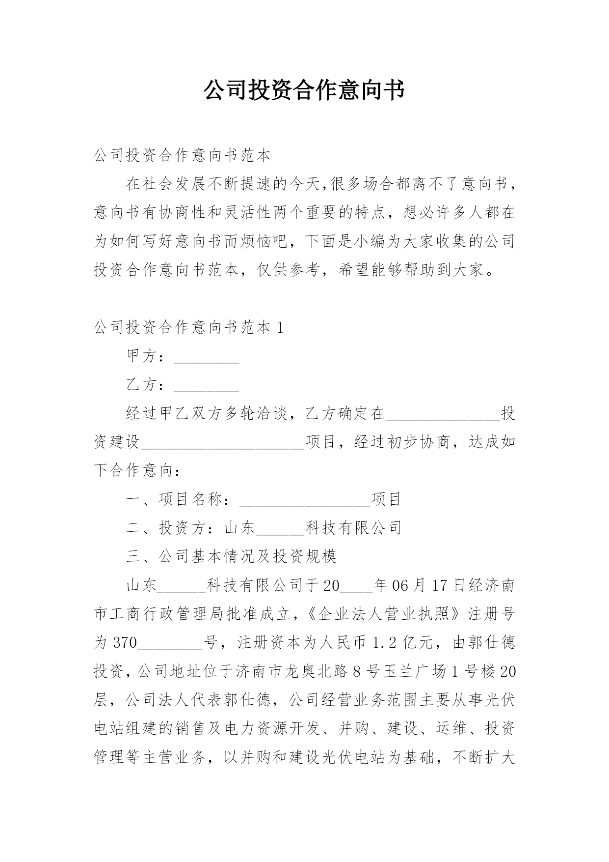 公司投资合作意向书公司投资合作意向书范本在社会发展不断提速的今天,很多场合都离不了意向书,意向书有协商性和灵活性两个重要的特点,想必许多人都在为如何写好意向书而烦恼吧,下面是小编为大家收集的公司投资合作意向书范本,仅供参考,希望能够帮助到大家。公司投资合作意向书范本1甲方:________乙方:________经过甲乙双方多轮洽谈,乙方确定在______________投资建设____________________项目,经过初步协商,达成如下合作意向:一、项目名称:________________项目二
