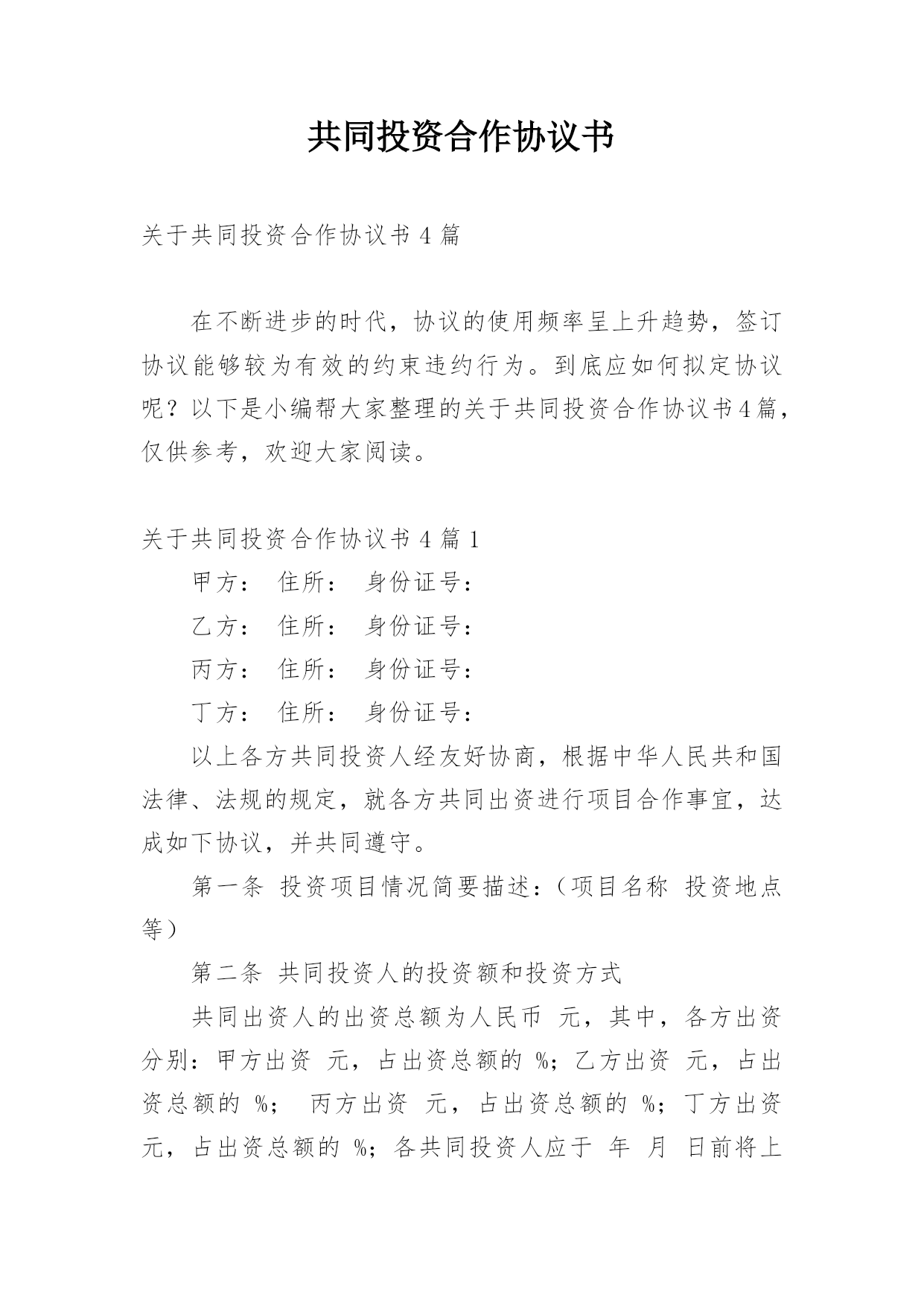 共同投资合作协议书关于共同投资合作协议书4篇在不断进步的时代,协议的使用频率呈上升趋势,签订协议能够较为有效的约束违约行为。到底应如何拟定协议呢?以下是小编帮大家整理的关于共同投资合作协议书4篇,仅供参考,欢迎大家阅读。关于共同投资合作协议书4篇1甲方:住所:身份证号:乙方:住所:身份证号:丙方:住所:身份证号:丁方:住所:身份证号:以上各方共同投资人经友好协商,根据中华人民共和国法律、法规的规定,就各方共同出资进行项目合作事宜,达成如下协议,并共同遵守。第一条投资项目情况简要描述:(项目名称投资地点等)
