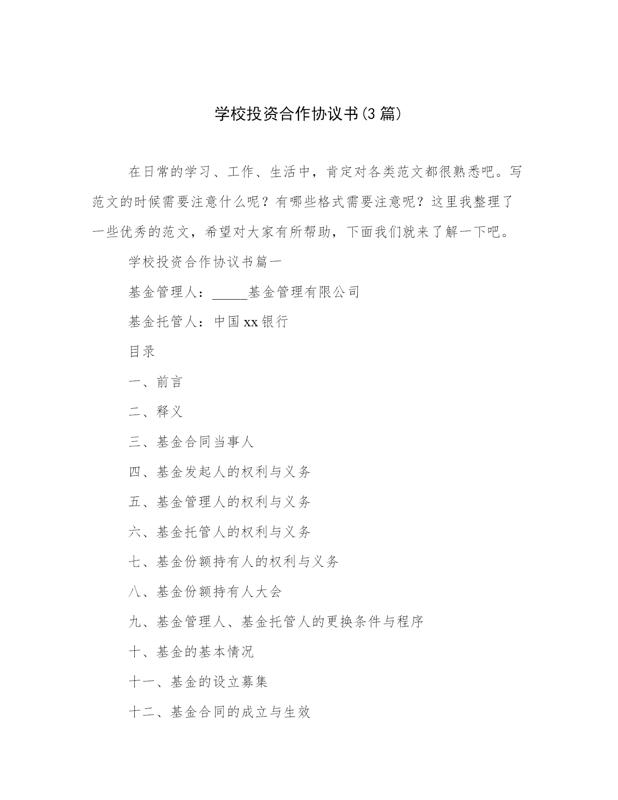 学校投资合作协议书(3篇)在日常的学习、工作、生活中,肯定对各类范文都很熟悉吧。写范文的时候需要注意什么呢?有哪些格式需要注意呢?这里我整理了一些优秀的范文,希望对大家有所帮助,下面我们就来了解一下吧。学校投资合作协议书篇一基金管理人:_____基金管理有限公司基金托管人:中国xx银行目录一、前言二、释义三、基金合同当事人四、基金发起人的权利与义务五、基金管理人的权利与义务六、基金托管人的权利与义务七、基金份额持有人的权利与义务八、基金份额持有人大会九、基金管理人、基金托管人的更换条件与程序十、基金的基本