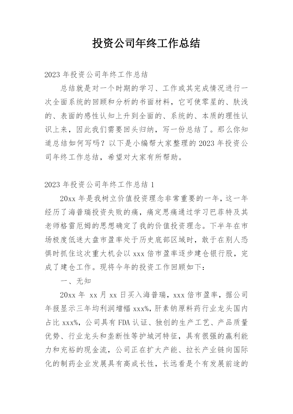 投资公司年终工作总结2023年投资公司年终工作总结总结就是对一个时期的学习、工作或其完成情况进行一次全面系统的回顾和分析的书面材料,它可使零星的、肤浅的、表面的感性认知上升到全面的、系统的、本质的理性认识上来,因此我们需要回头归纳,写一份总结了。那么你知道总结如何写吗?以下是小编帮大家整理的2023年投资公司年终工作总结,希望对大家有所帮助。2023年投资公司年终工作总结120xx年是我树立价值投资理念非常重要的一年,这一年经历了海普瑞投资失败的痛,痛定思痛通过学习巴菲特及其老师格雷厄姆的思想确定了我的价