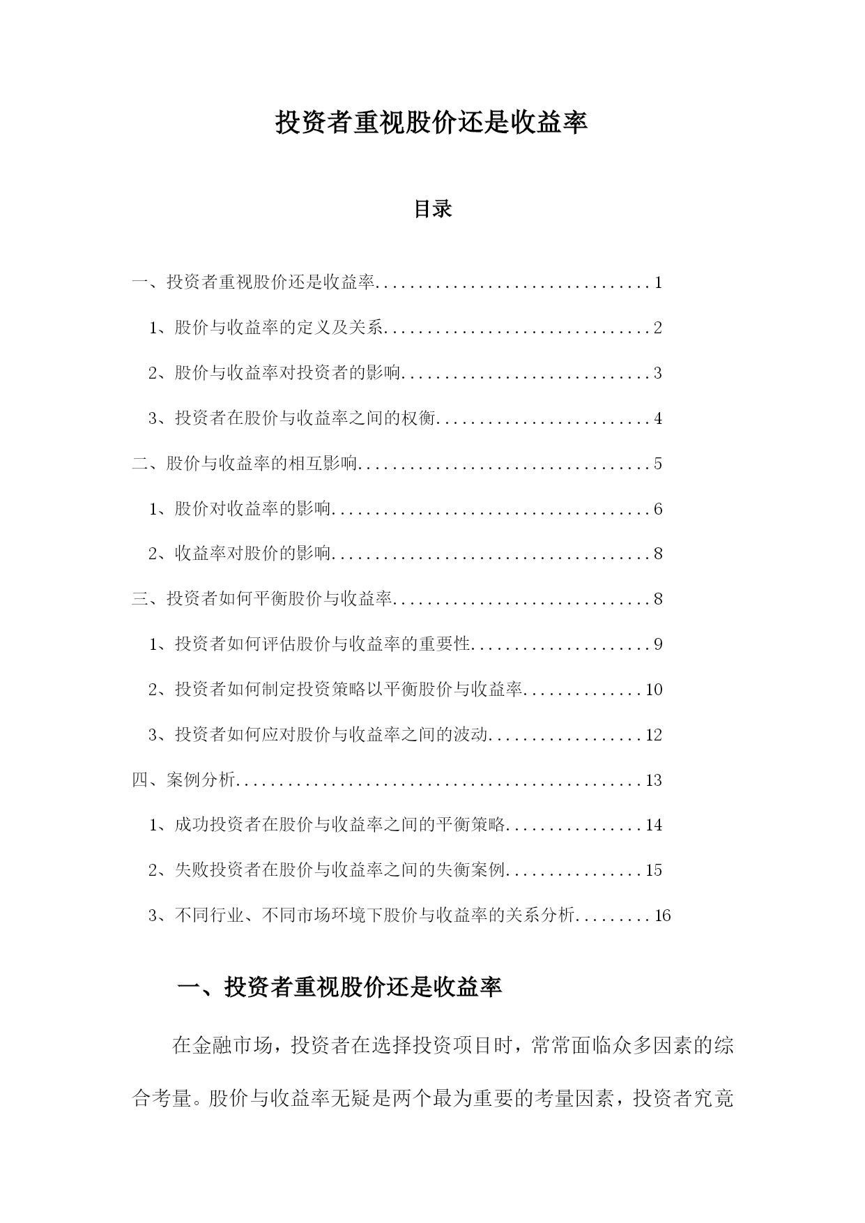 投资者重视股价还是收益率目录一、投资者重视股价还是收益率................................11、股价与收益率的定义及关系...............................22、股价与收益率对投资者的影响.............................33、投资者在股价与收益率之间的权衡.........................4二、股价与收益率的相互影响..................................51、股价对收益率的影响.